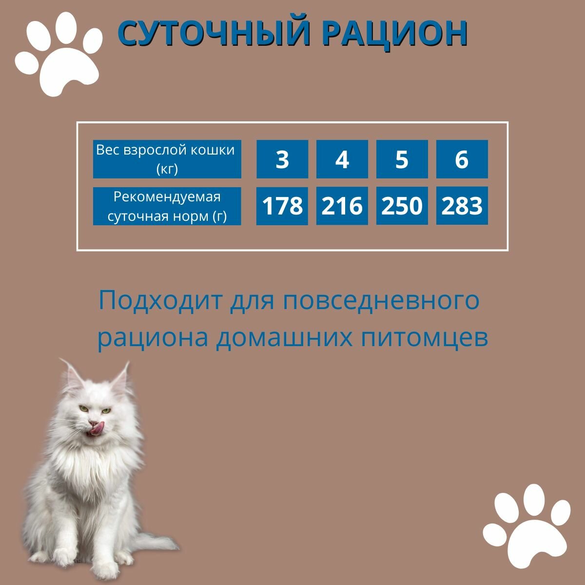 | Дозировка | - вес кошки 3 кг - 164 г - вес кошки 4 кг - 200 г - вес кошки 5 кг - 230 г - вес кошки 6 кг - 261 г |
