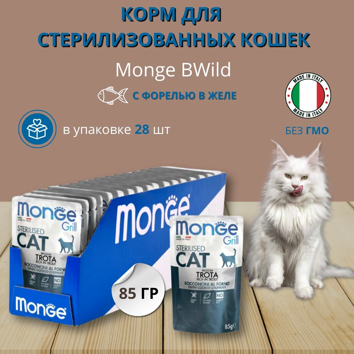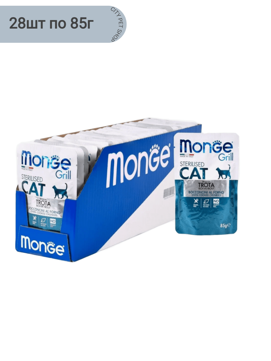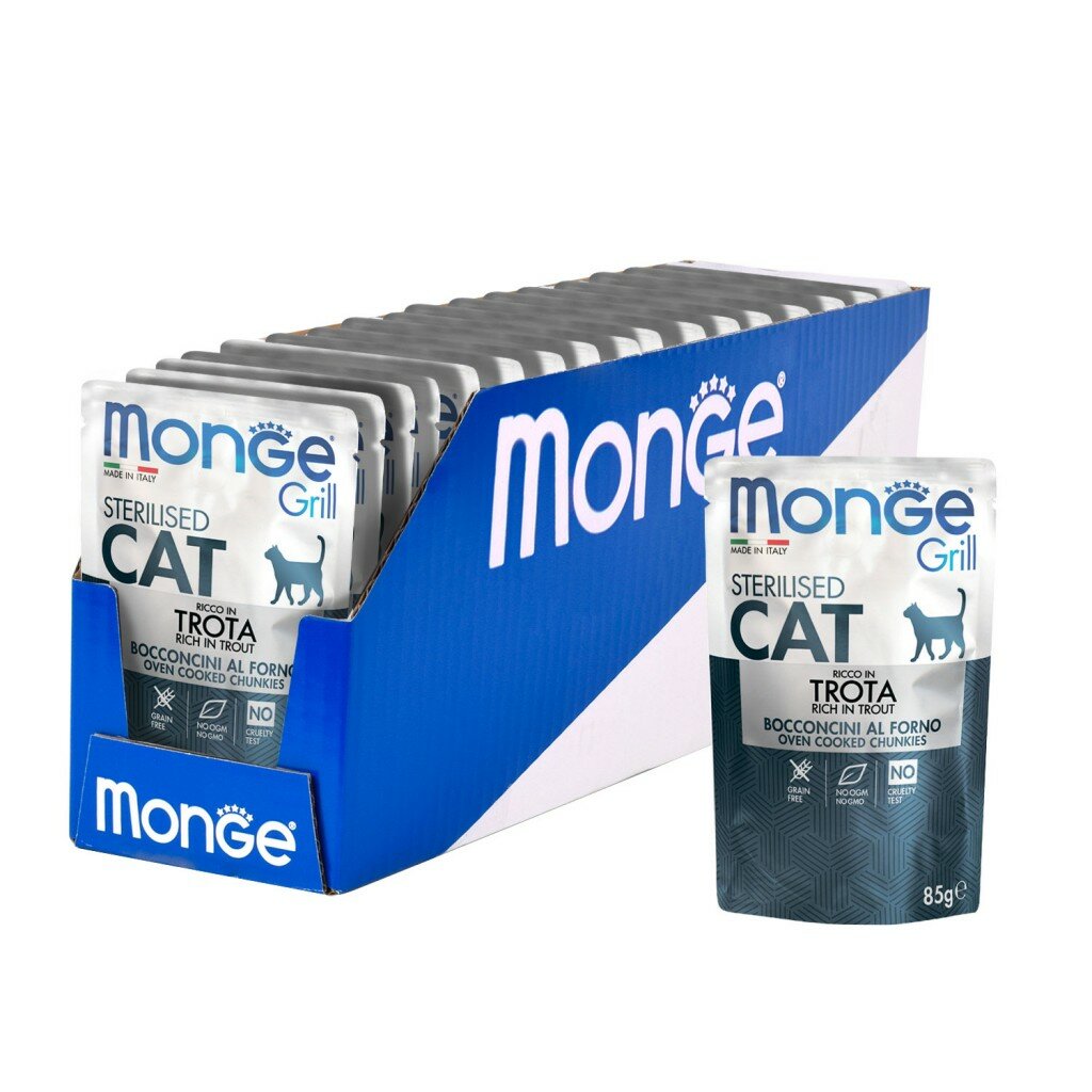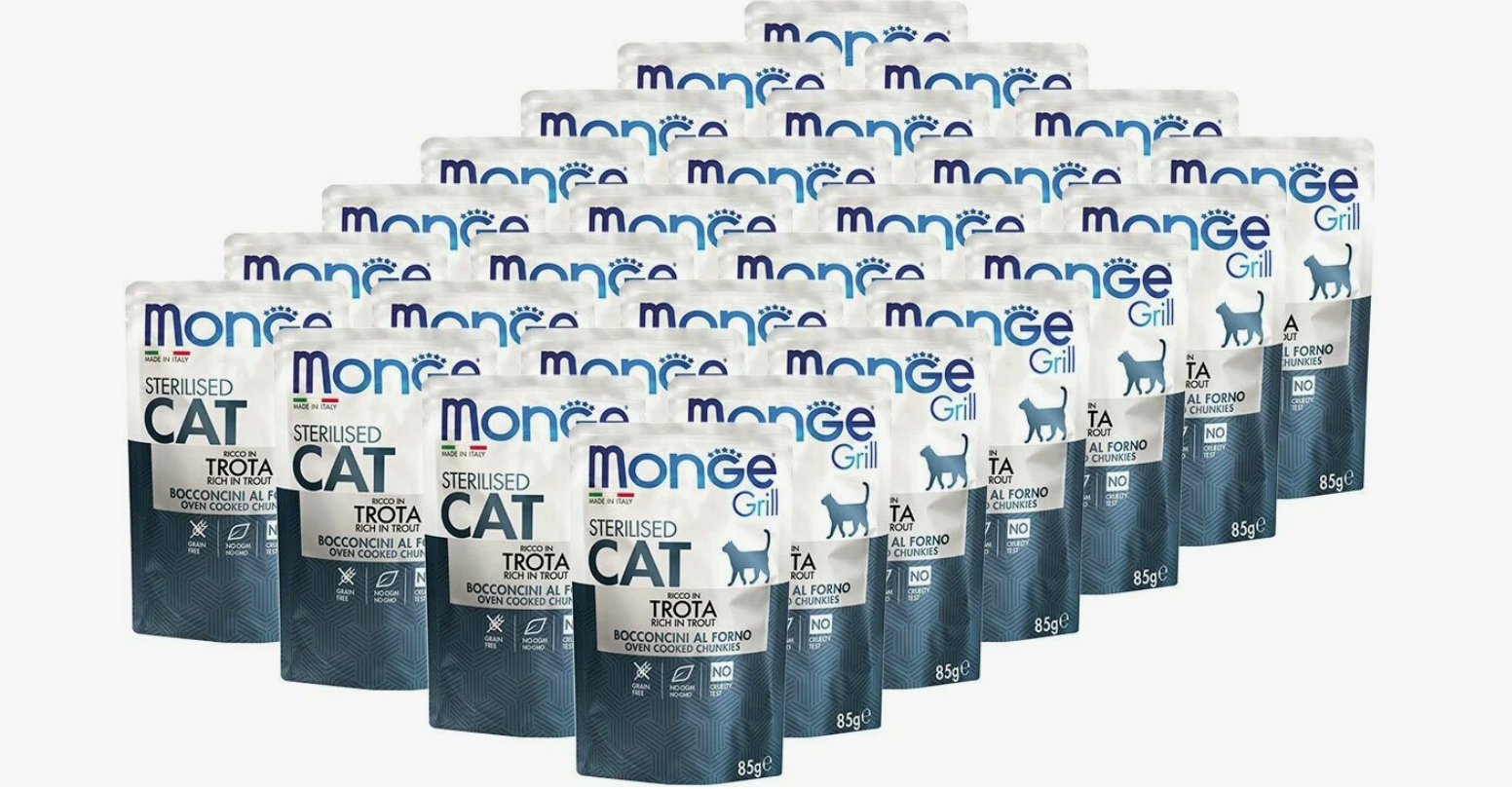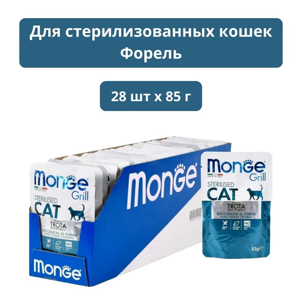 Корм для кошек MONGE Cat Grill Pouch для стерилизованных кошек итальянская форель пауч 85г (упаковка - 28 шт)