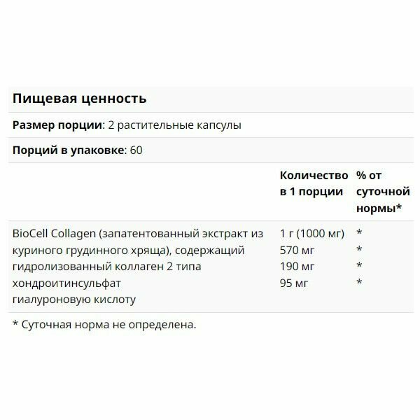 | Дополнительная информация | количество в порции (2 капсулы):коллаген BioCell (запатентованный экстракт хряща грудины цыпленка, обеспечивающий) - 1000 мг, гидролизованный коллаген II типа - 500 мг, сульфат хондроитина - 190 мг, гиалуроновая кислота - 95 мг. |