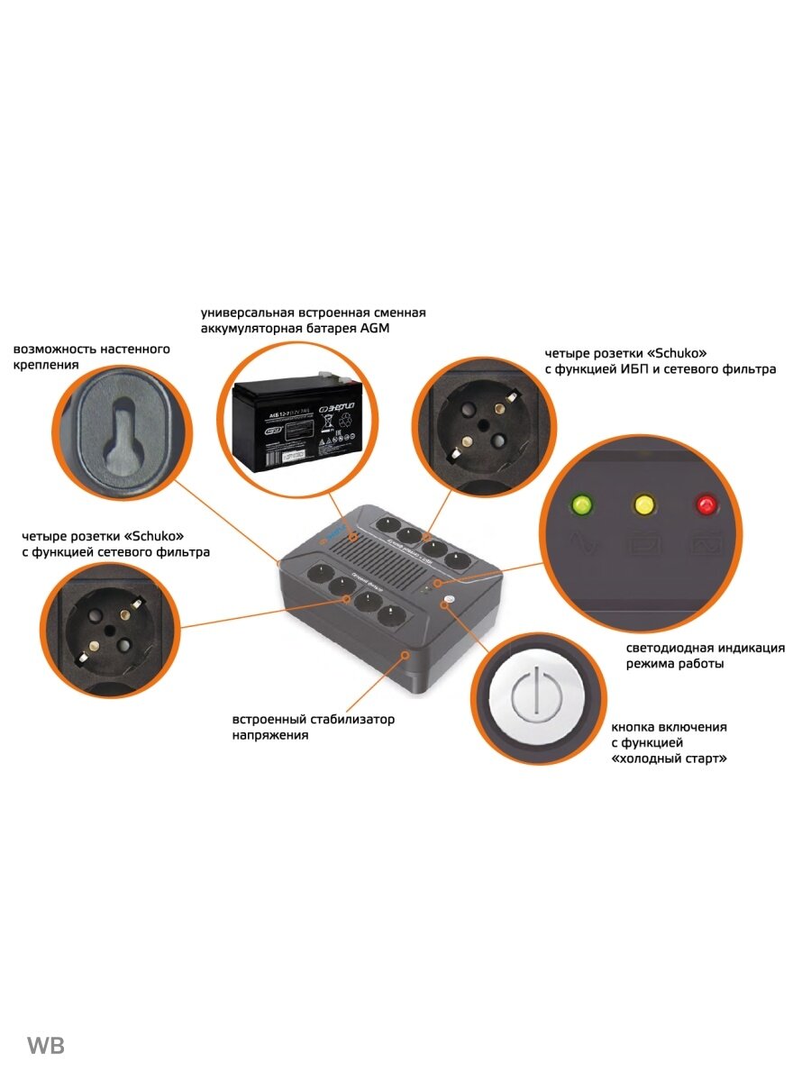 | Плюсы: | Много розеток, половина работает как сетевой фильтр, половина с питанием при отключении энергии, стандартная схема большинства ИБП. В розетки удобно включать, расположены сверху прибора, лампочки стандартные - зеленая, желтая, красная. Желтая моргает - заряжается. Желтая горит - батарея заряжена, выяснил методом тыка. |