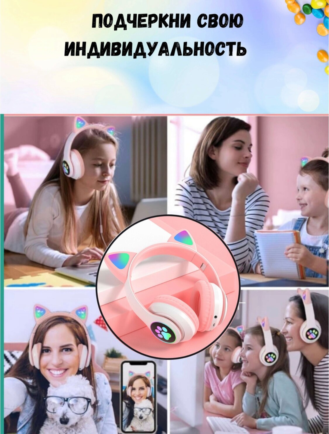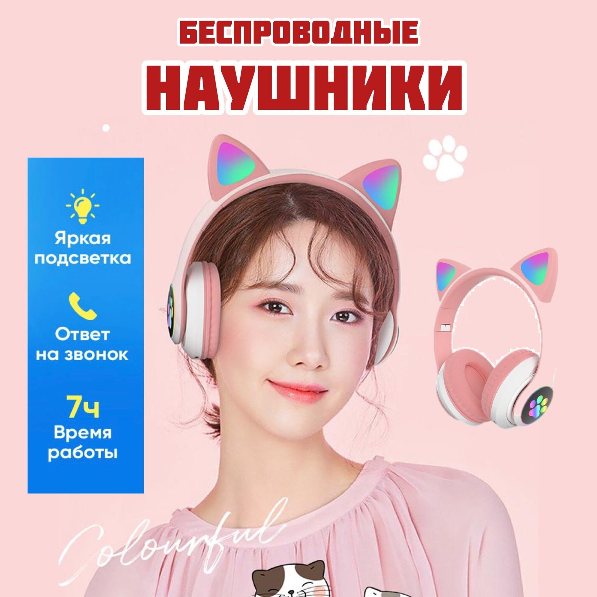 Наушники беспроводные детские с ушками / Светящиеся детские беспроводные наушники с ушками / Беспроводные наушники детские / Наушники с ушами розовые