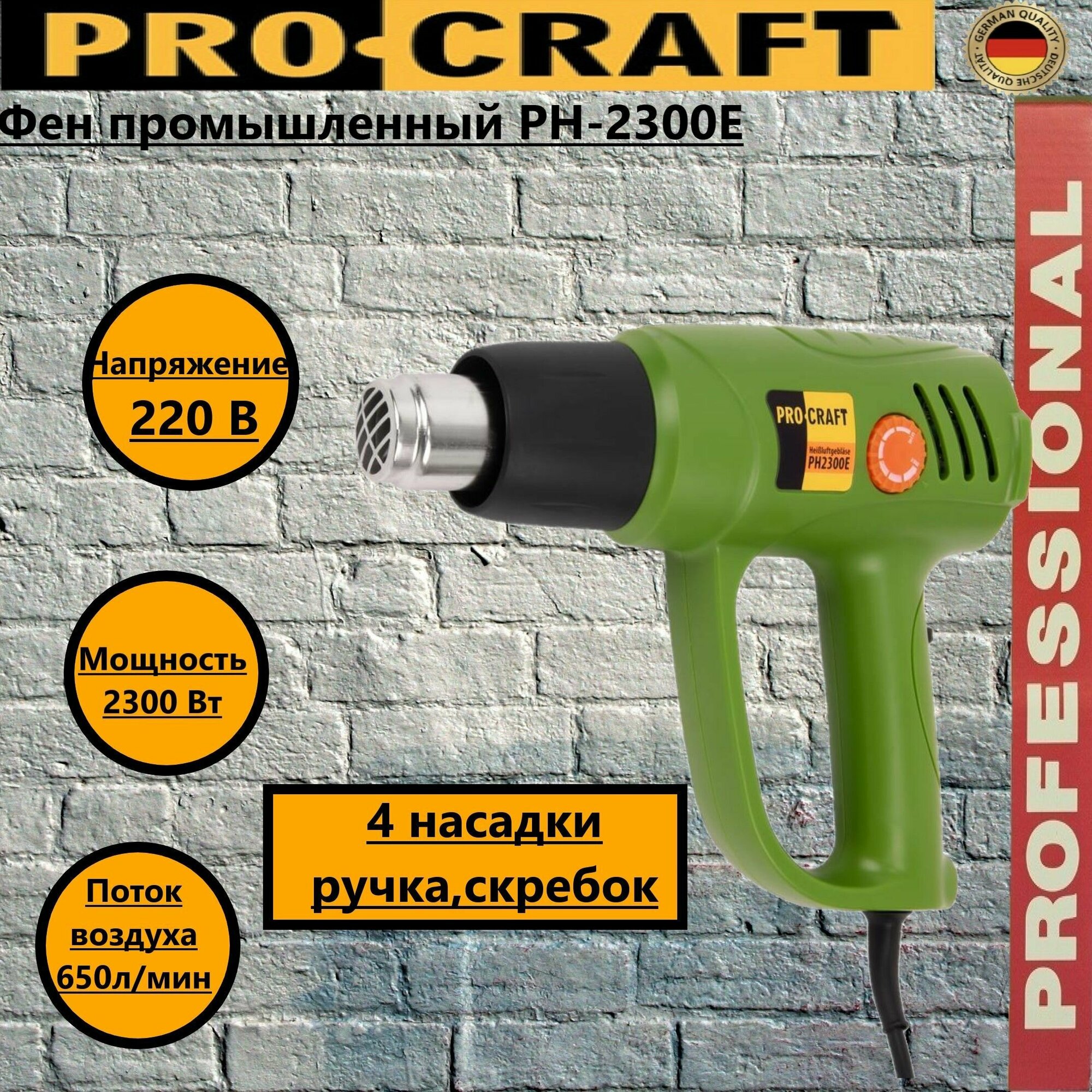 Фен промышленный ProCraft PH2300Е, 4 насадки, 600 градусов, 2300Вт, 650л/мин интересное:
