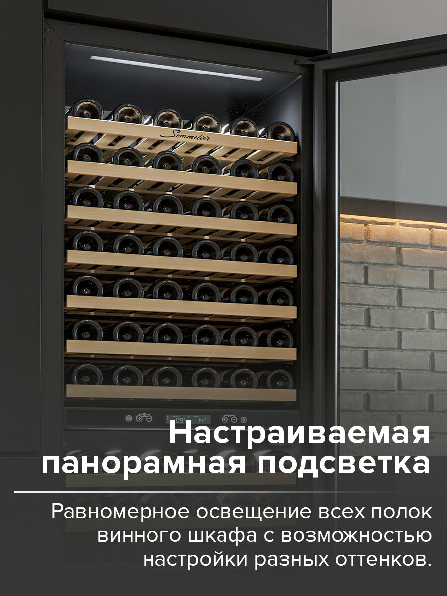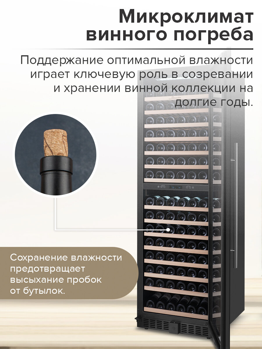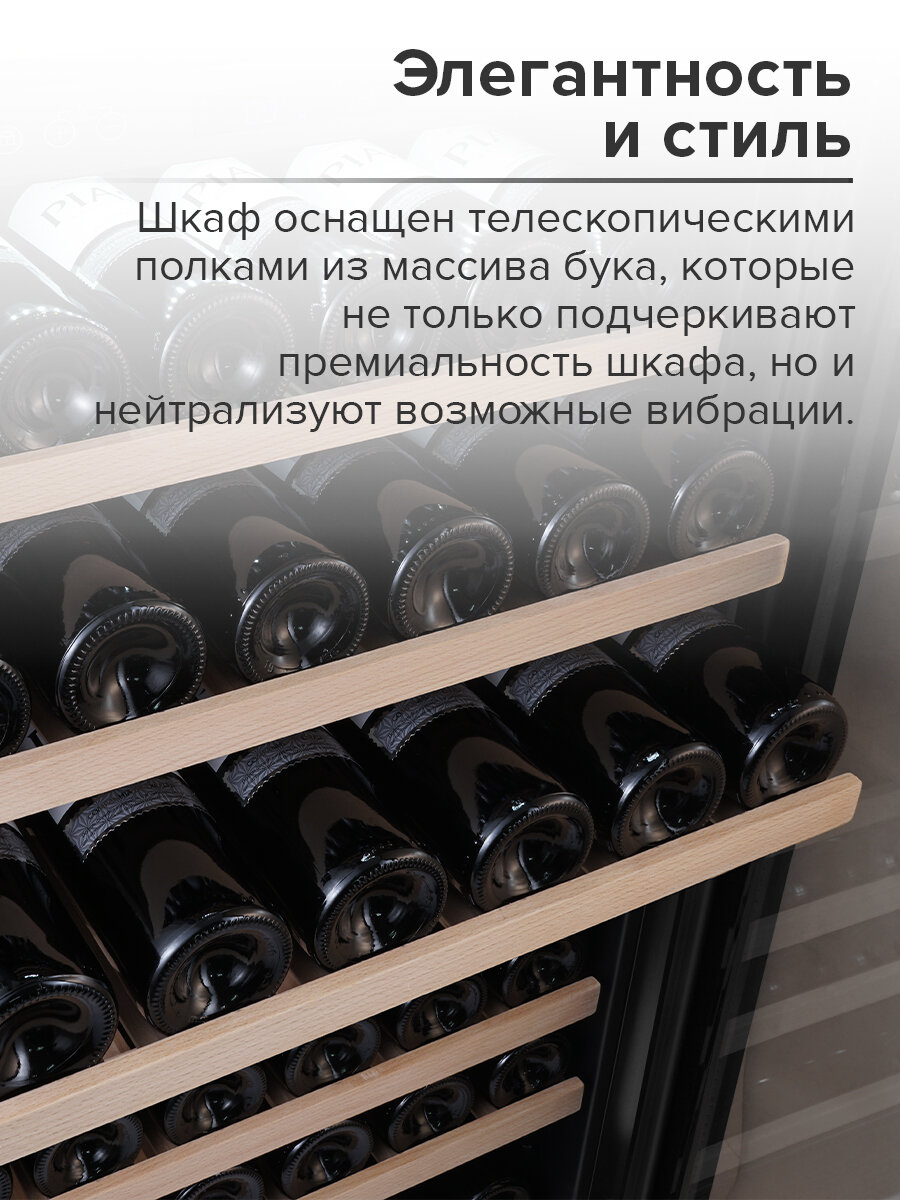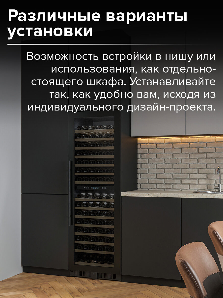 | Плюсы: | 15 полок из дерева, которые беспрепятственно выдвигаются со своих пазов и позволяют хранить до 165 бутылок. Дверь устанавливается с любой удобной стороны. Сенсорное управление температурой. Оптимальный уровень влажности. |