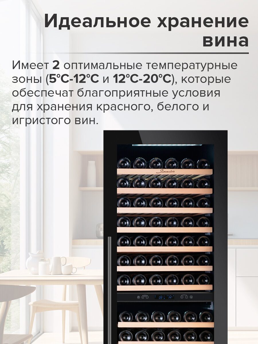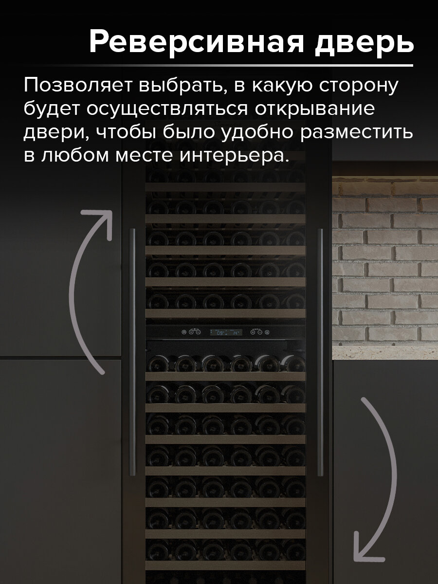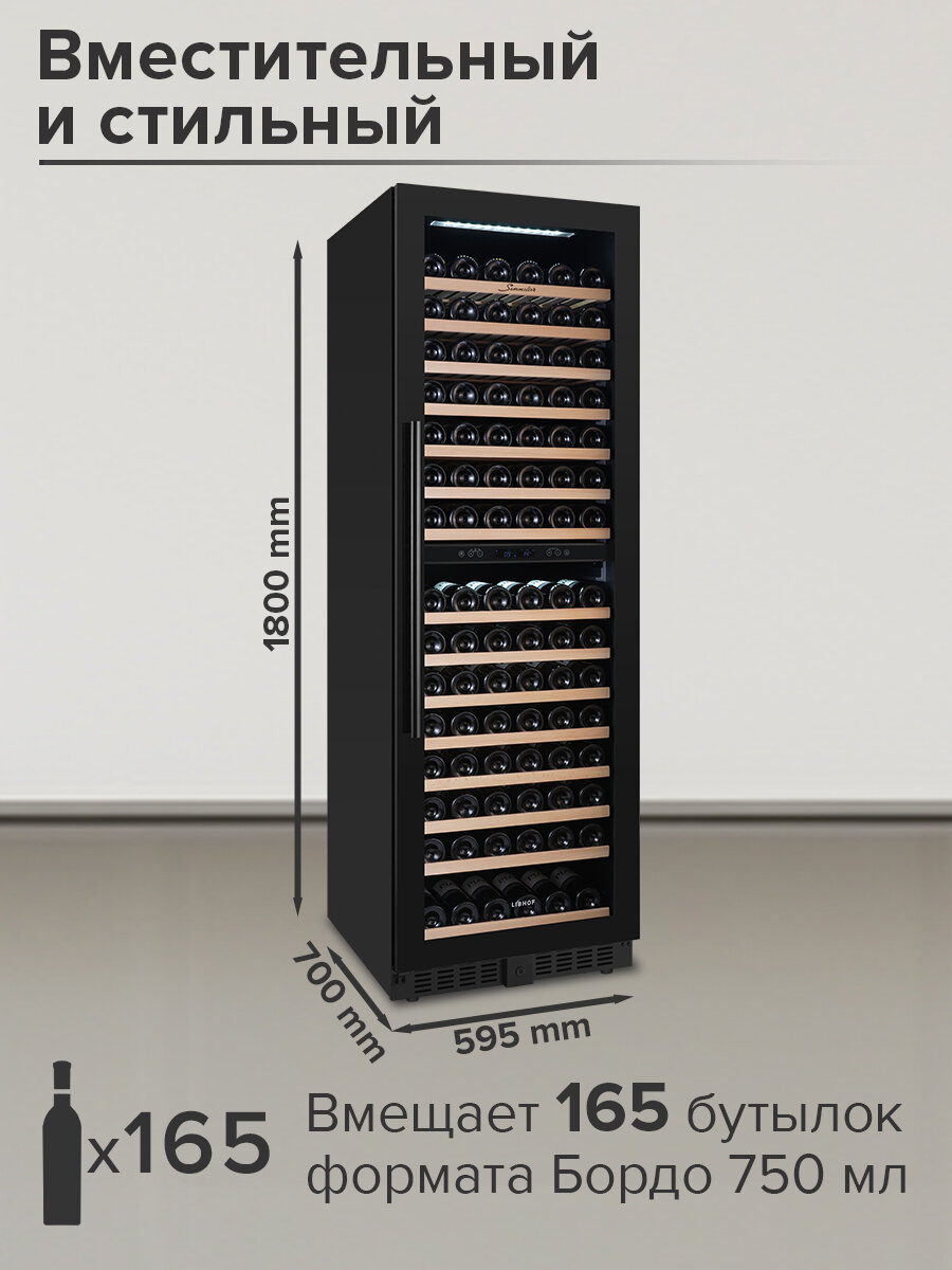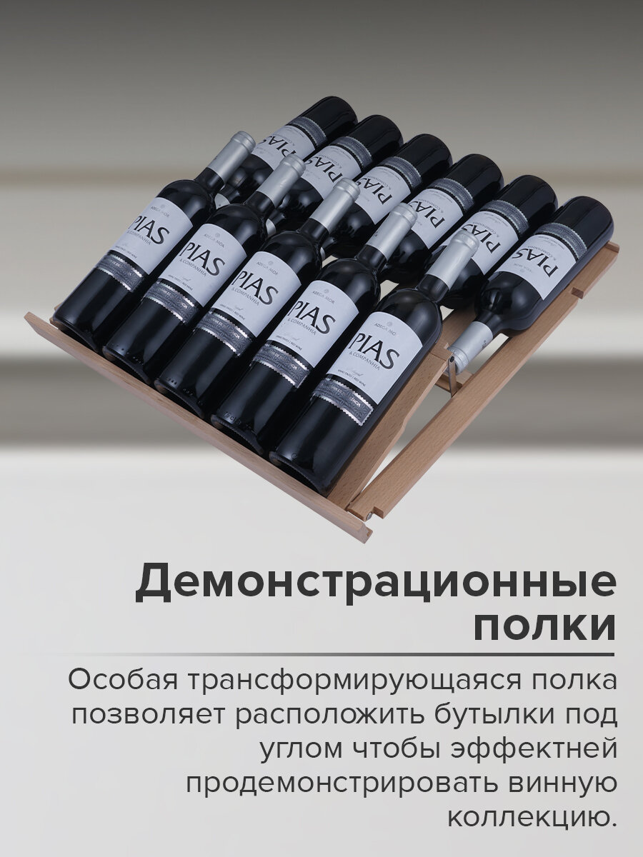 | Плюсы: | 15 полок из дерева, которые беспрепятственно выдвигаются со своих пазов и позволяют хранить до 165 бутылок. Дверь устанавливается с любой удобной стороны. Сенсорное управление температурой. Оптимальный уровень влажности. |