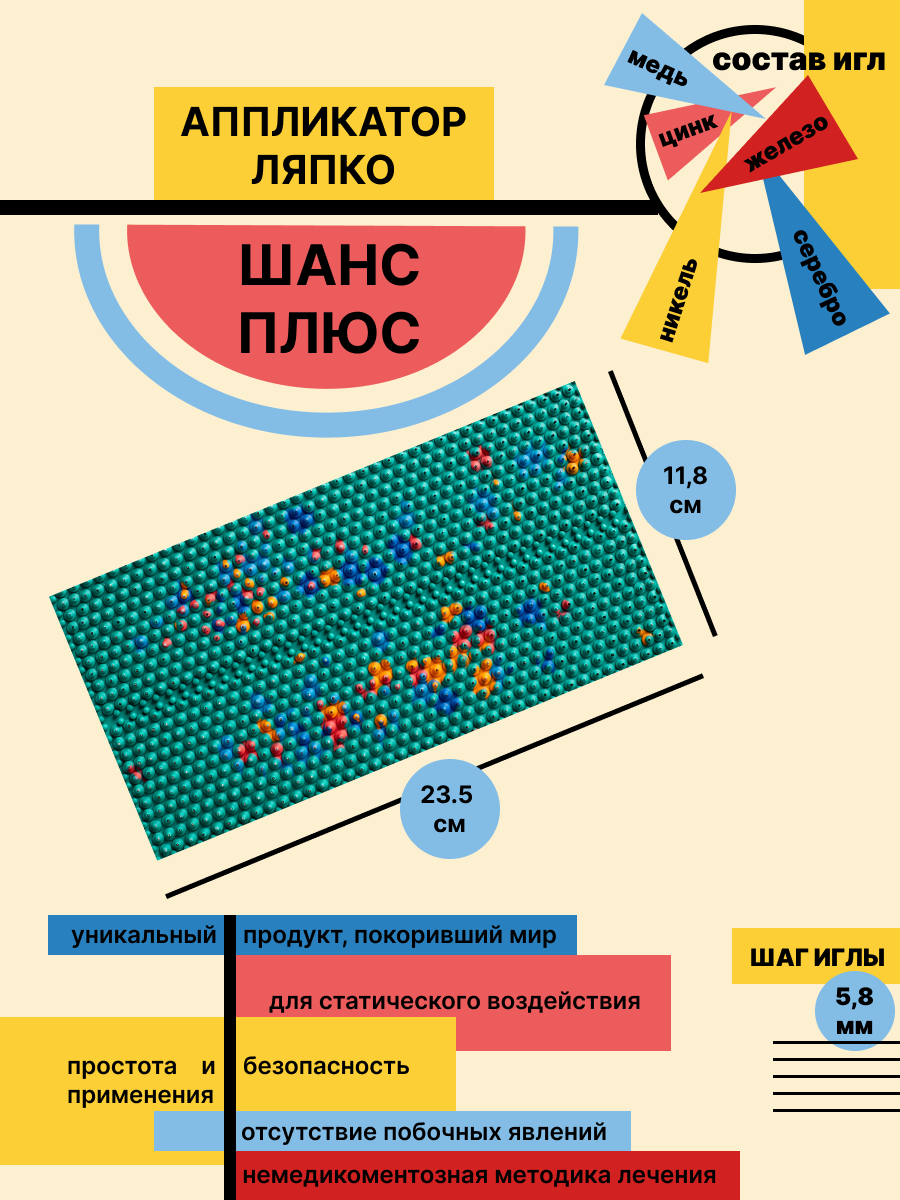 Массажер аппликатор коврик Ляпко Шанс-плюс 5,8, шаг игл 5.8 мм (23.5 x 11.8 см, игл - 890 шт.), в ассортименте