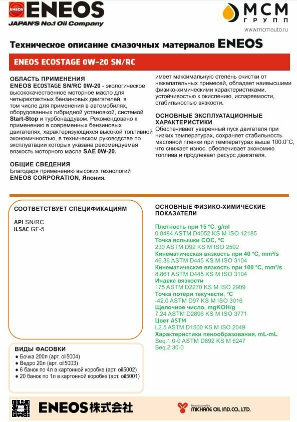 Ниже Вы можете прочитать отзывы на Синтетическое моторное масло ENEOS Ecostage SN/RC 0W-20, 1 л, ознакомится с подробными характеристиками, посмотреть интересные обзоры и фотографии на Синтетическое моторное масло ENEOS Ecostage SN/RC 0W-20, 1 л.