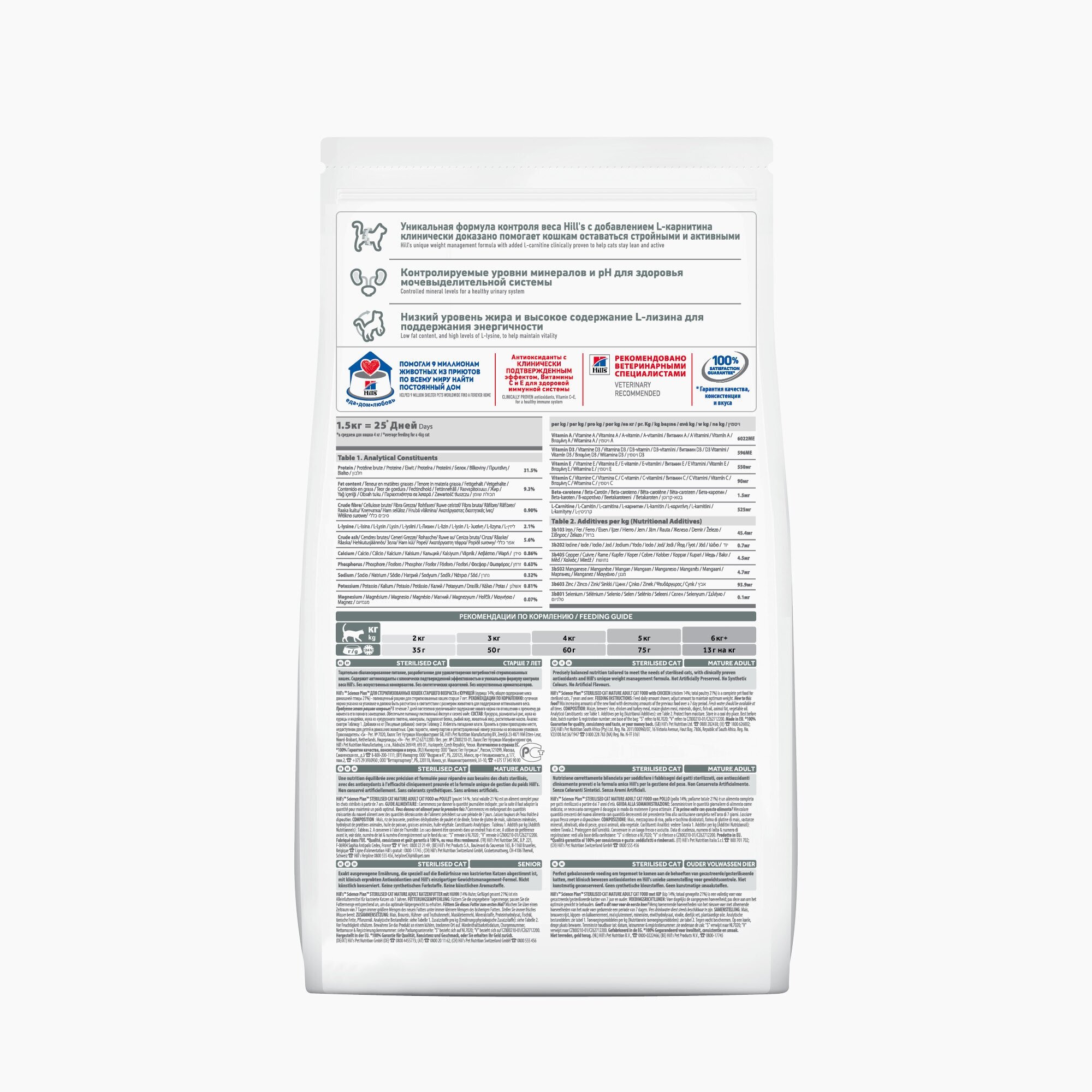 | Дозировка | Следуйте рекомендациям по кормлению, указанным на упаковке. Скорректируйте количество корма в соответствии с размером вашего питомца для поддержания оптимального веса. Если у вас есть сомнения, обратитесь к ветеринарному специалисту. Пробуете этот корм впервые? В течение 7 дней постепенно увеличивайте содержание нового корма по отношению к прежнему до момента его полного замещения. У кошки всегда должен быть доступ к чистой питьевой воде! Потребности ваших питомцев в питании могут меняться с возрастом. Уточняйте у вашего ветеринарного специалиста подходит ли текущий рацион вашему питомцу на каждом осмотре. |