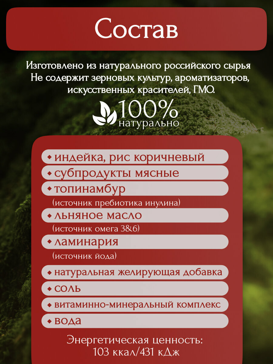 | Состав | индейка, субпродукты мясные, рис коричневый, топинамбур, льняное масло, ламинария, натуральная желирующая добавка, соль, витаминно-минеральный комплекс, вода |