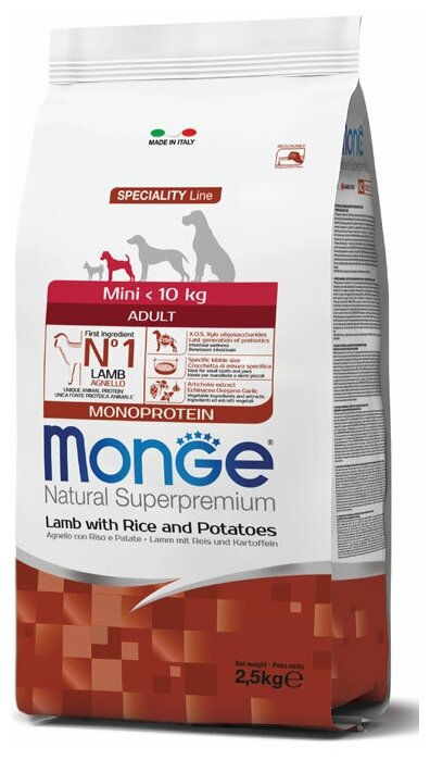 Купить Сухой корм Monge Dog Speciality Line Monoprotein Mini, для взрослых собак мелких пород, из ягненка с рисом и картофелем 2,5 кг