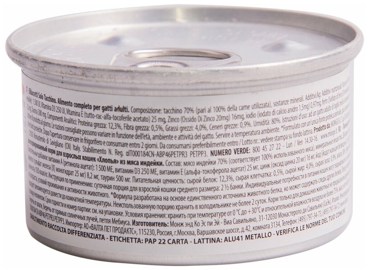 Влажный корм для кошек Monge Monoprotein Solo Tacchino, беззерновой, с индейкой, 12 шт. х 80 г