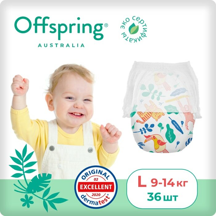 Трусики-подгузники Offspring расцветка Джунгли L (9-14 кг) 36 шт