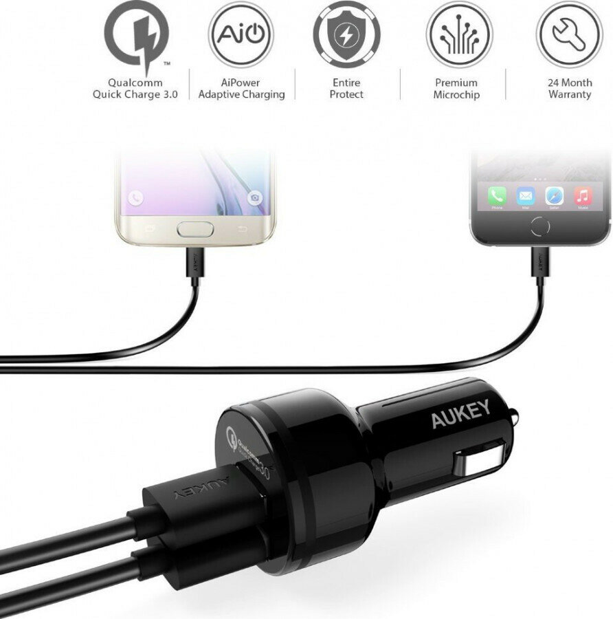 Aukey АЗУ + кабель Micro USB Aukey QC 2.0/3.0 Car Charger 33 Ватт 3A/2USB Black черные CC-T7