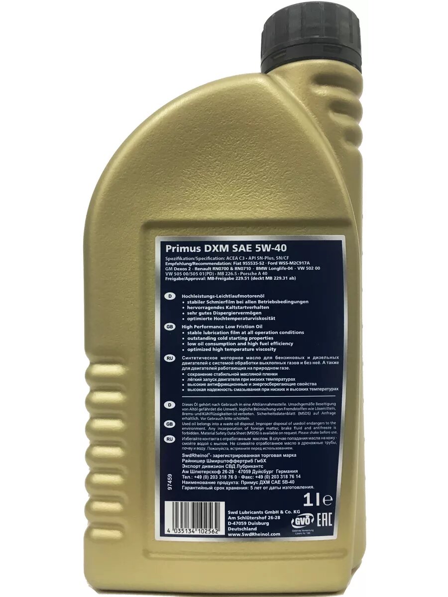 SWD Rheinol Swd Rheinol Primus Dxm 5w-40 (Sn/Cf/A3/B4/C3) Синт. 5л Масло Моторное
