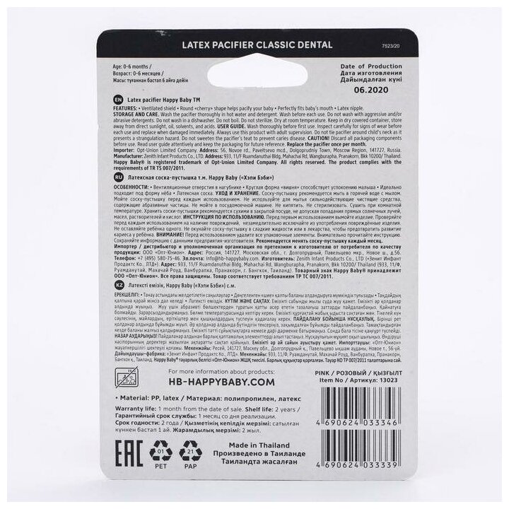 13023, Соска-пустышка латексная, 0-6 Happy Baby (pink)
