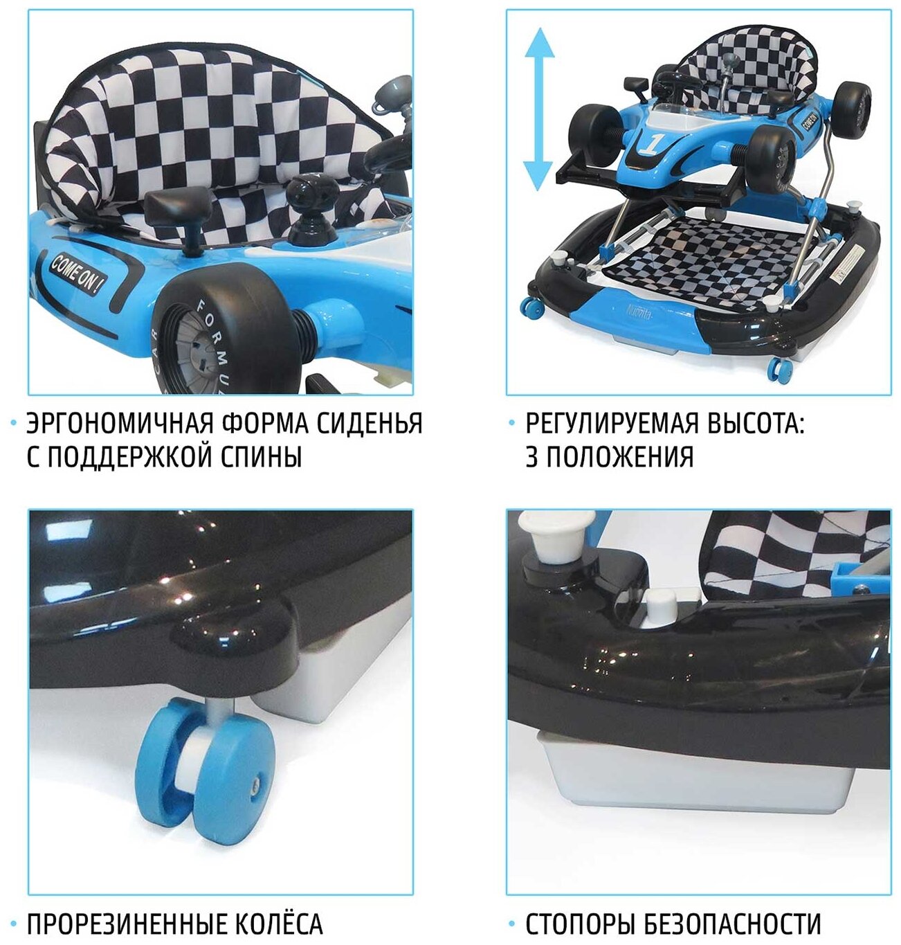 | Отзыв: | Покупкой таких необычных ходунков решили заинтересовать ребенка, у нас это получилось, мало того, что ребенок сам просится в ходунки, потому что они напоминают управление машиной, так еще и с интересом играет за панелью. В повороты входит без проблем, колеса не скрипучие. |