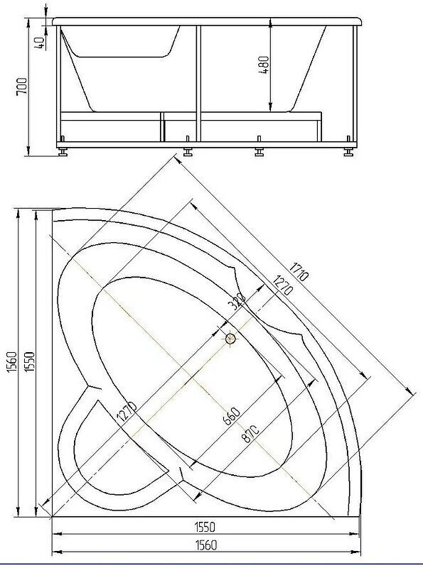 Акриловая ванна Aquatek Поларис-2 155х155 POL2-0000041 без гидромассажа с фронтальной панелью с каркасом (вклеенный) со слив-переливом