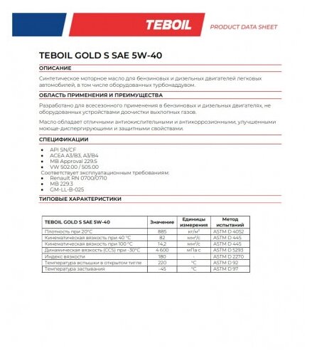 TEBOIL 19022 Масло моторное TEBOIL GOLD S 5W-40 синтетическое 1 л 19022
