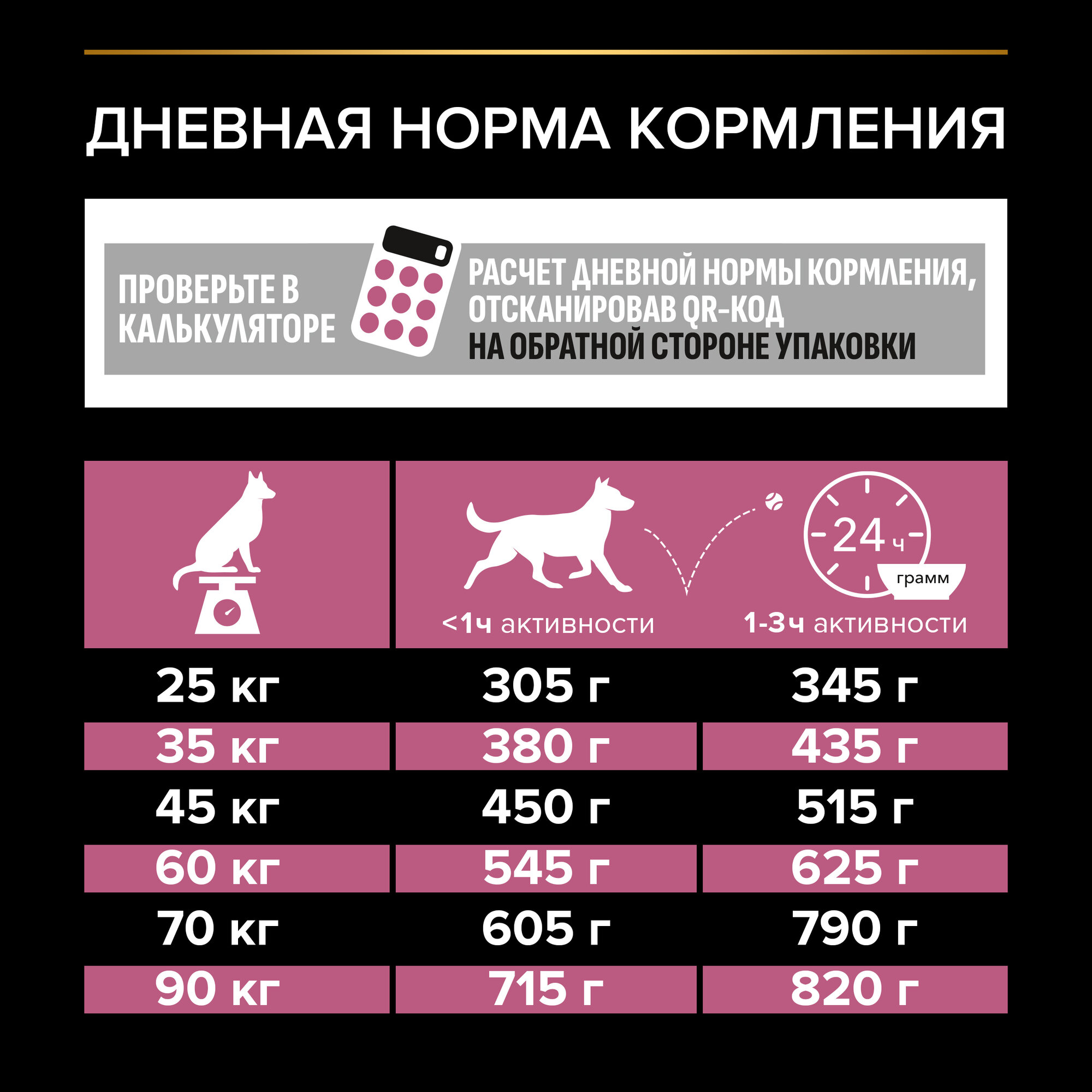 | Дополнительная информация | Рекомендации по кормлению: Используйте таблицу для определения суточной нормы кормления вашей собаки. Указанные нормы рекомендованы для поддержания собаки в оптимальной физической форме. Меняйте суточную норму кормления в зависимости от уровня активности собаки, ее физических особенностей и индивидуальных потребностей. Следите, чтобы у собаки всегда была чистая, свежая питьевая вода. Для контроля здоровья вашей собаки обращайтесь в ветеринарную клинику на регулярной основе. К собакам атлетического телосложения (одинаковые размеры грудной клетки и талии “Форма цилиндра”) относятся: Боксер, Далматинец, Доберман, Пинчер, Немецкая овчарка, Грейт Дейн, Грейхаунд, Ирландская лайка, Пойнтер, Сеттер, Веймаранер. |