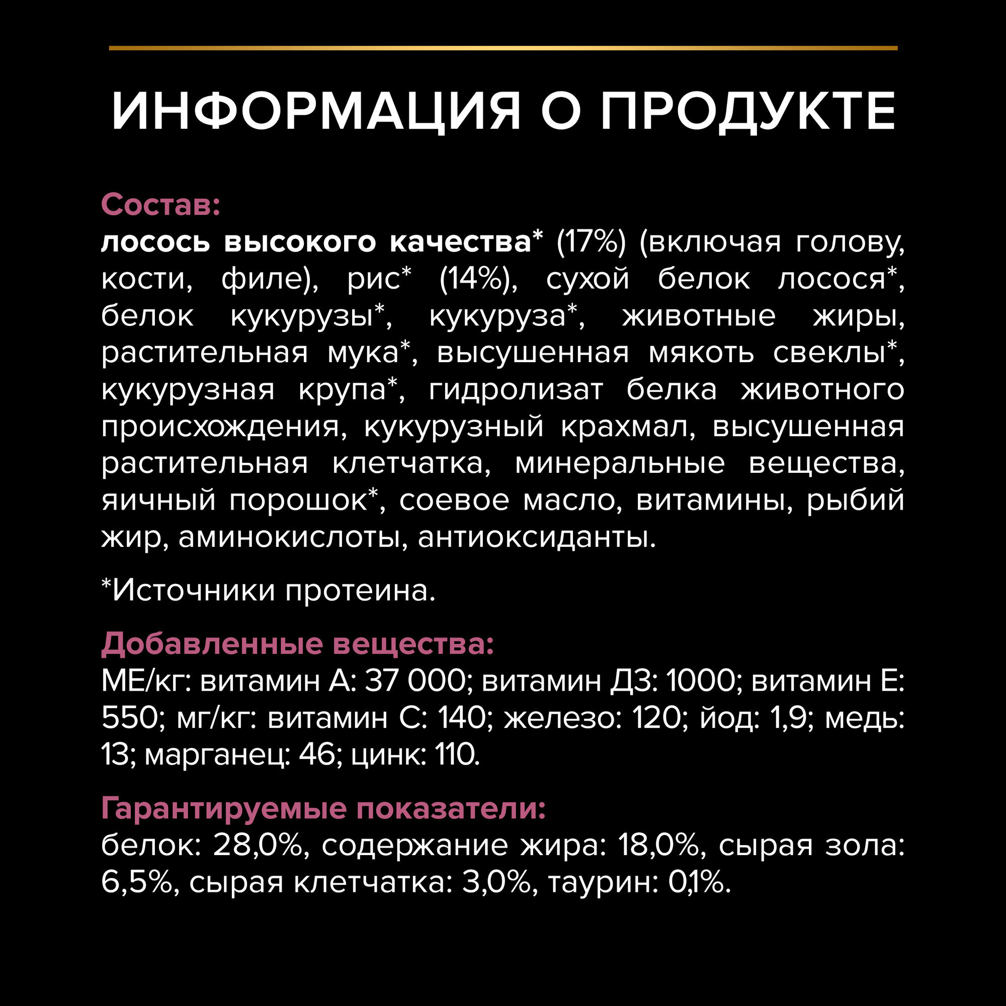| Пищевая ценность | белок: 28,0%; жир: 18,0%; сырая зола: 7,0%; сырая клетчатка: 3,0%; таурин: 0,1% |
