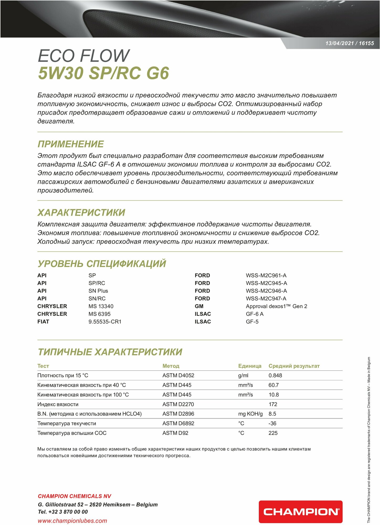СохранитьМасло Моторное Champion Eco Flow 5W30 Sp/Rc G6 4L Ilsac: Approval Gf-6 A CHAMPION OIL арт. 1047286 интересное:
