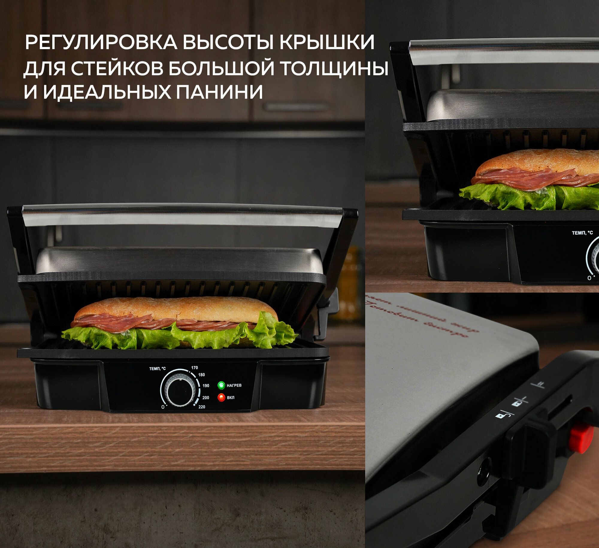 | Особенности | антипригарное покрытие / контактный гриль / поддон для сбора жира / регулировка высоты верхней панели |