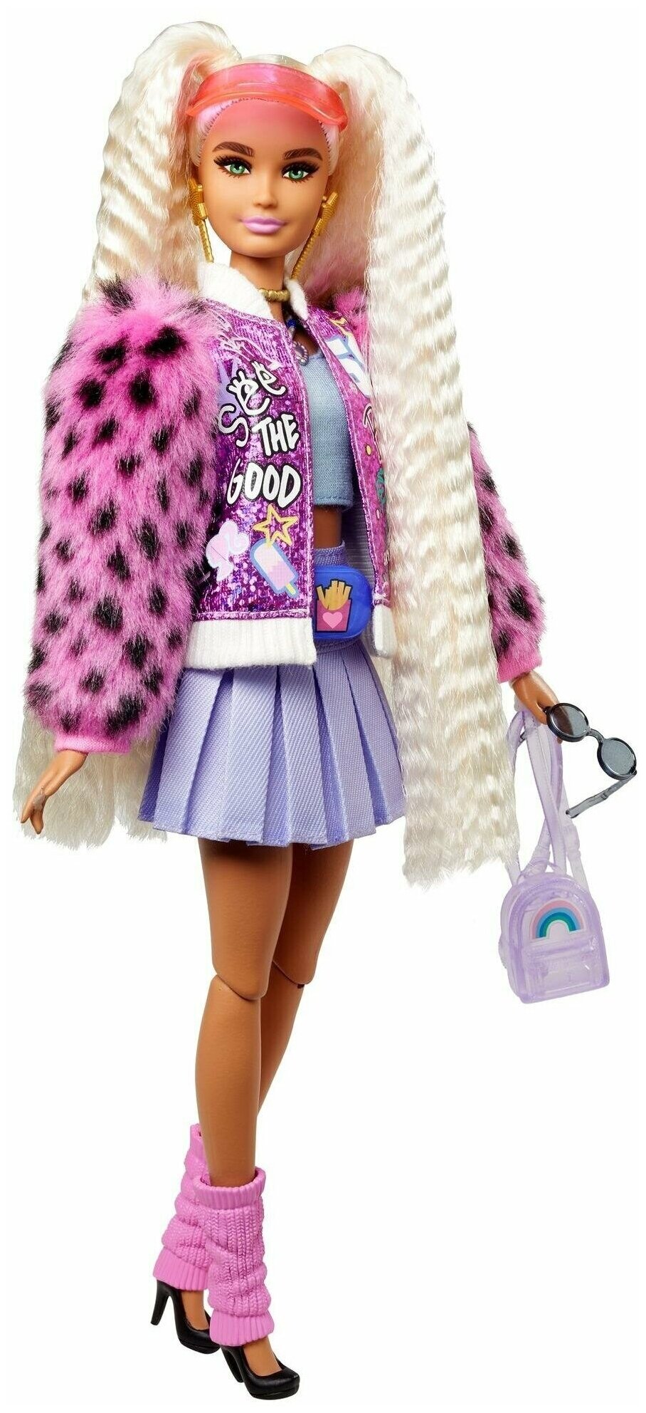 | Дополнительная информация | Барби Экстра следует принципу – чем больше модных деталей, тем лучше! В наборе вместе с куклой вы найдете 15 предметов для создания смелого образа – одежду, модные аксессуары и даже забавного питомца! Длинные светлые гофрированные волосы Барби собраны в два хвостика на макушке. Кукла одета в короткую плиссированную юбку и розовую куртку с графическими принтами и “пушистыми” рукавами. Яркий образ дополняют идеально подобранные аксессуары – изящный рюкзак, поясная сумка, очки, розовые гетры, туфли на каблуках и многое другое. Маленький медвежонок на роликах с аксессуарами выглядит просто восхитительно! Отличный подарок для детей, которые обожают моду и любят быть в центре внимания. Игра с куклой Барби “Экстра” способствуют развитию творческого самовыражения детей через увлекательные игры с модными аксессуарами. |
