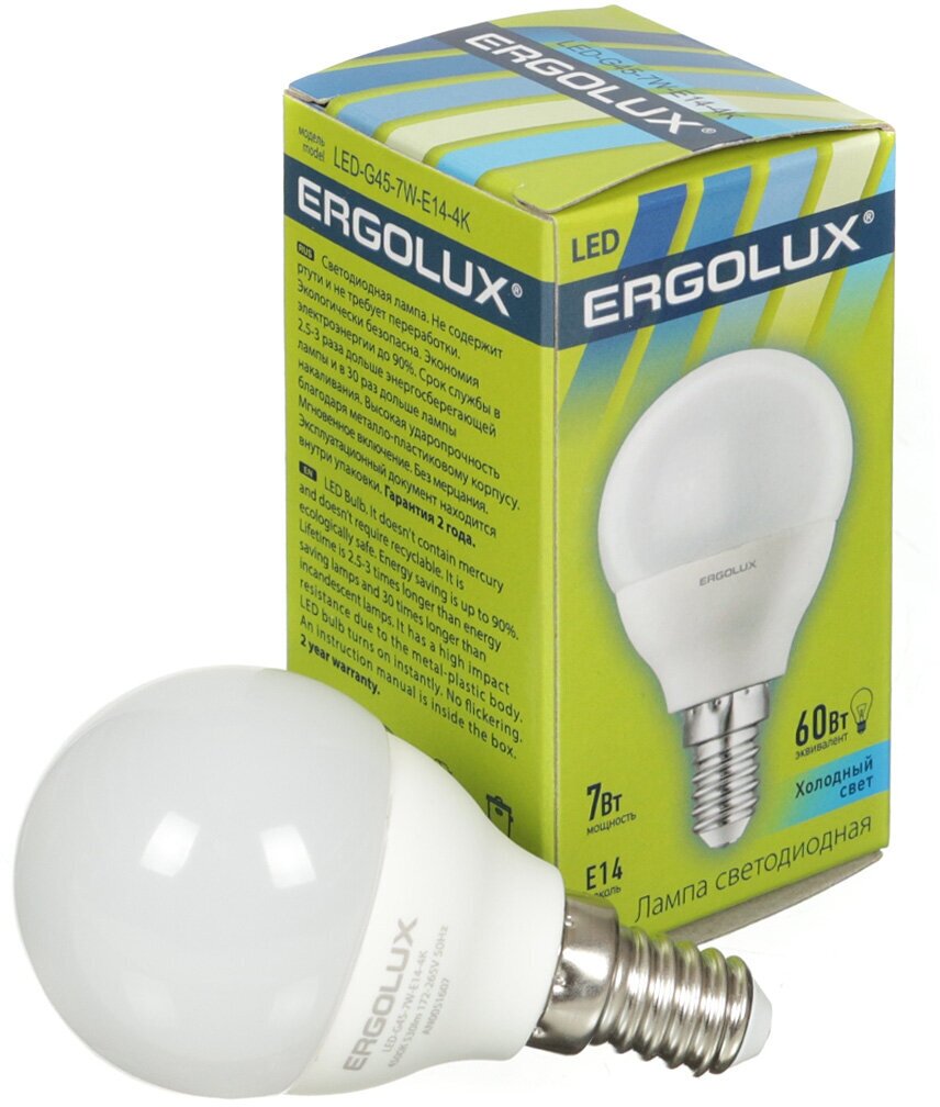 СохранитьLED лампа шарик 7Вт Е14 4500К(холодный свет) - LED-G45-7W-E14-4K (Ergolux) (код 12144) интересное: