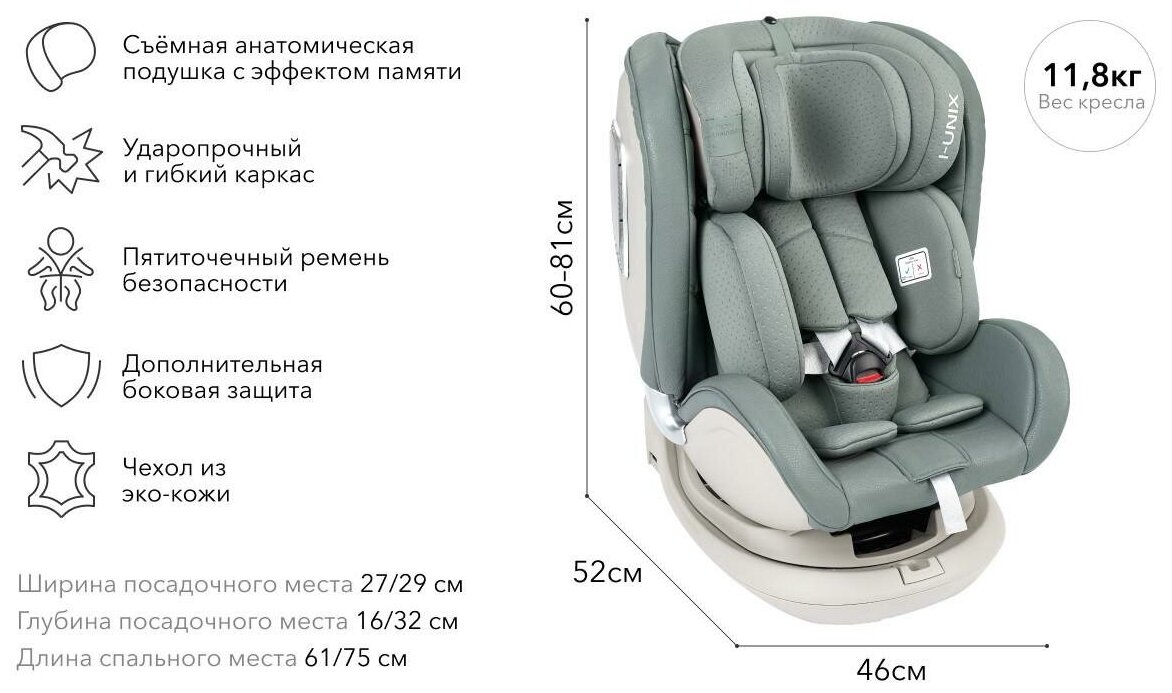 | Опции | поддержка головы новорожденного / съемные внутренние ремни / защита от боковых ударов / поворотный механизм / съемный чехол / положение для сна / положение для сна |