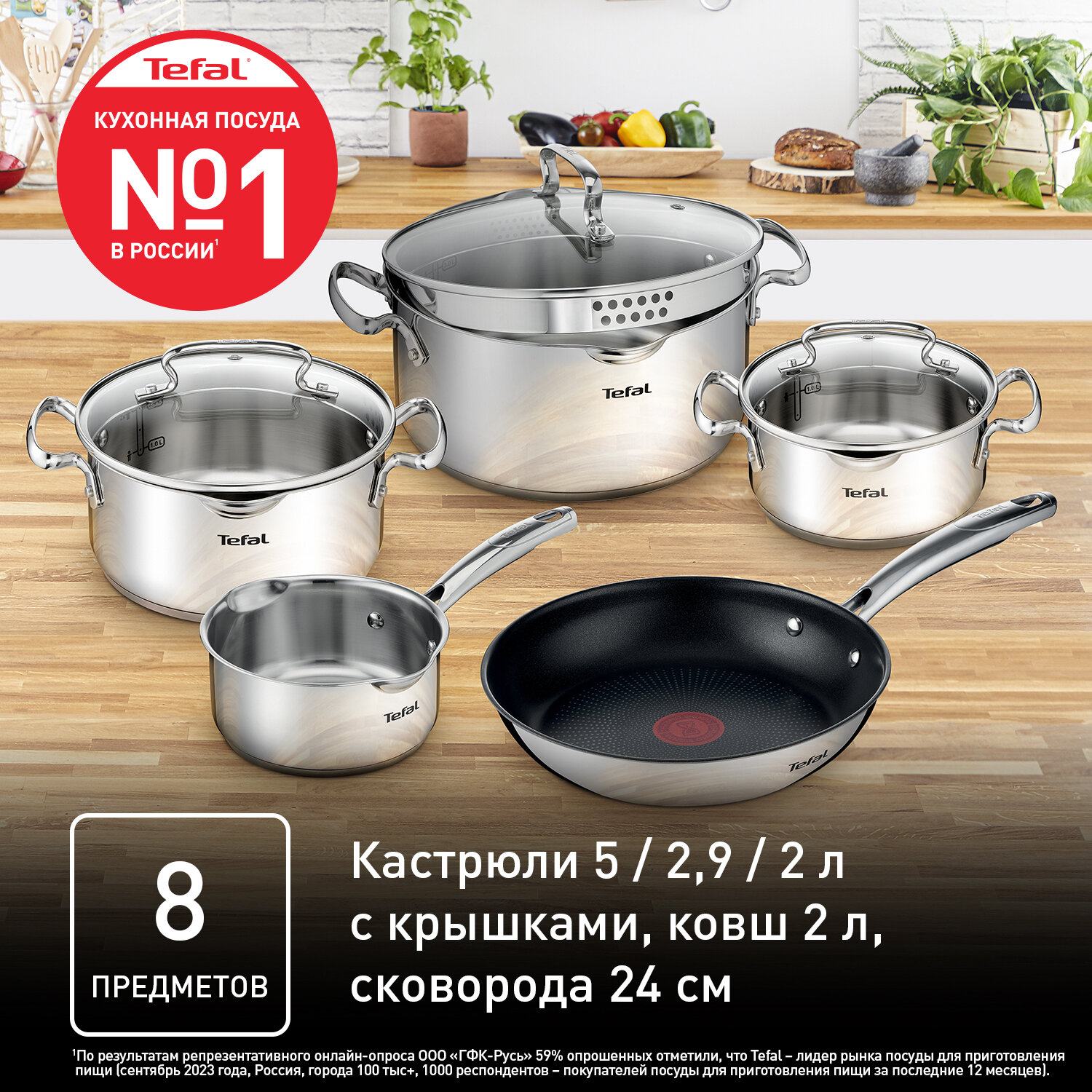 Купить Набор посуды из нержавеющей стали Tefal Duetto+ G732S855, 8 предметов, кастрюли, ковш и сковорода с толстым дном, для газовых, электрических и индукционных плит