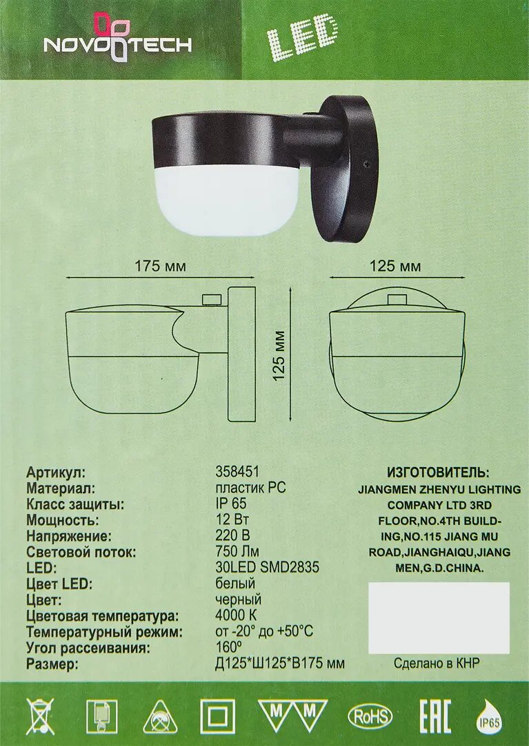 Novotech 358451 STREET NT20 395 черный Ландшафтный настенный светильник IP65 LED 4000K 12W 220V OPAL