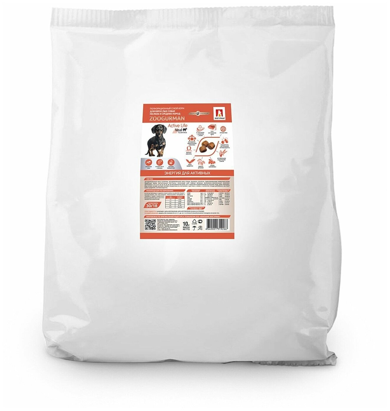 ZOOGURMAN ACTIVE LIFE для активных взрослых собак маленьких и средних пород с телятиной (10 кг)
