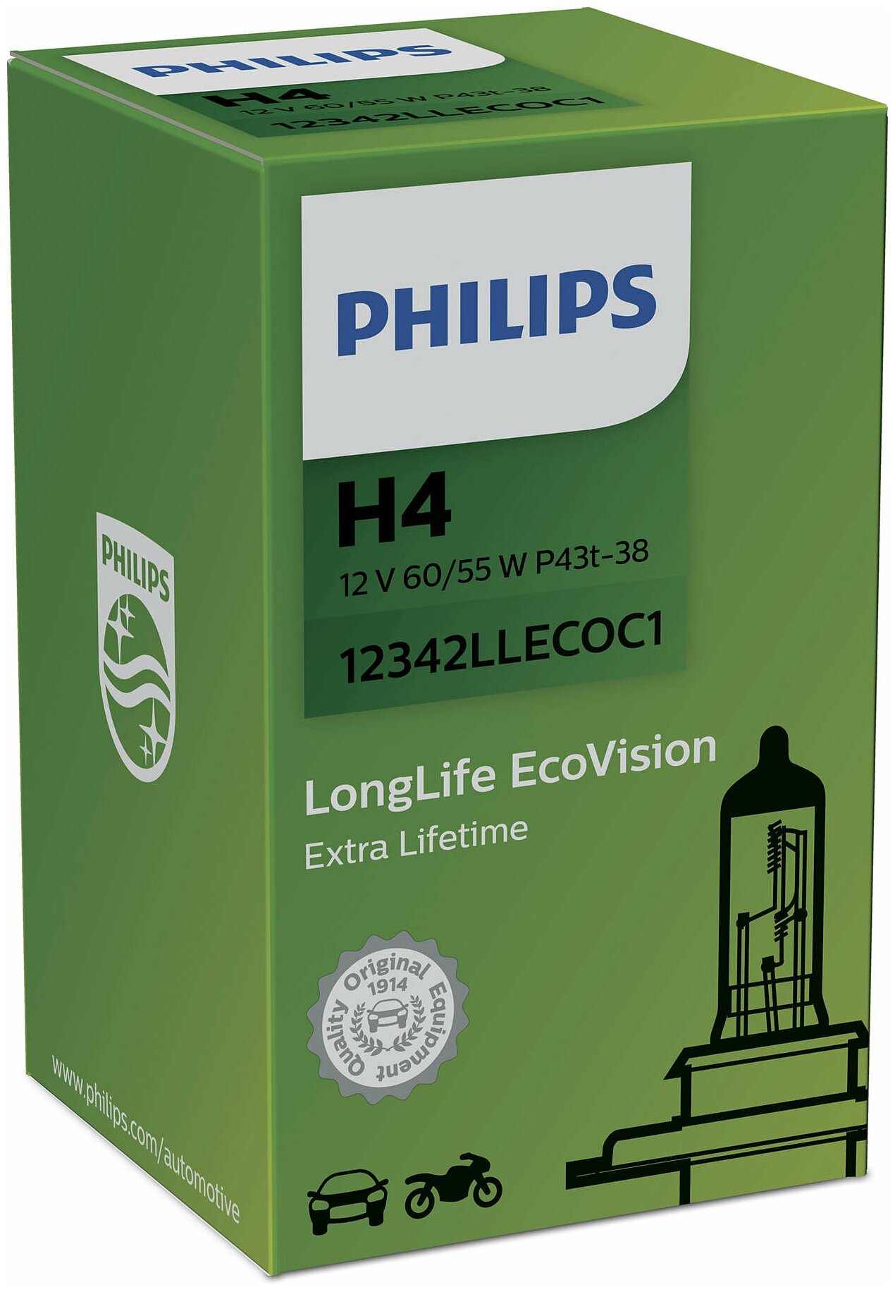 Лампа Philips LongLife EcoVision H4, 12V 60/55W P43t (1 шт.) PHILIPS-12342LLECOC1