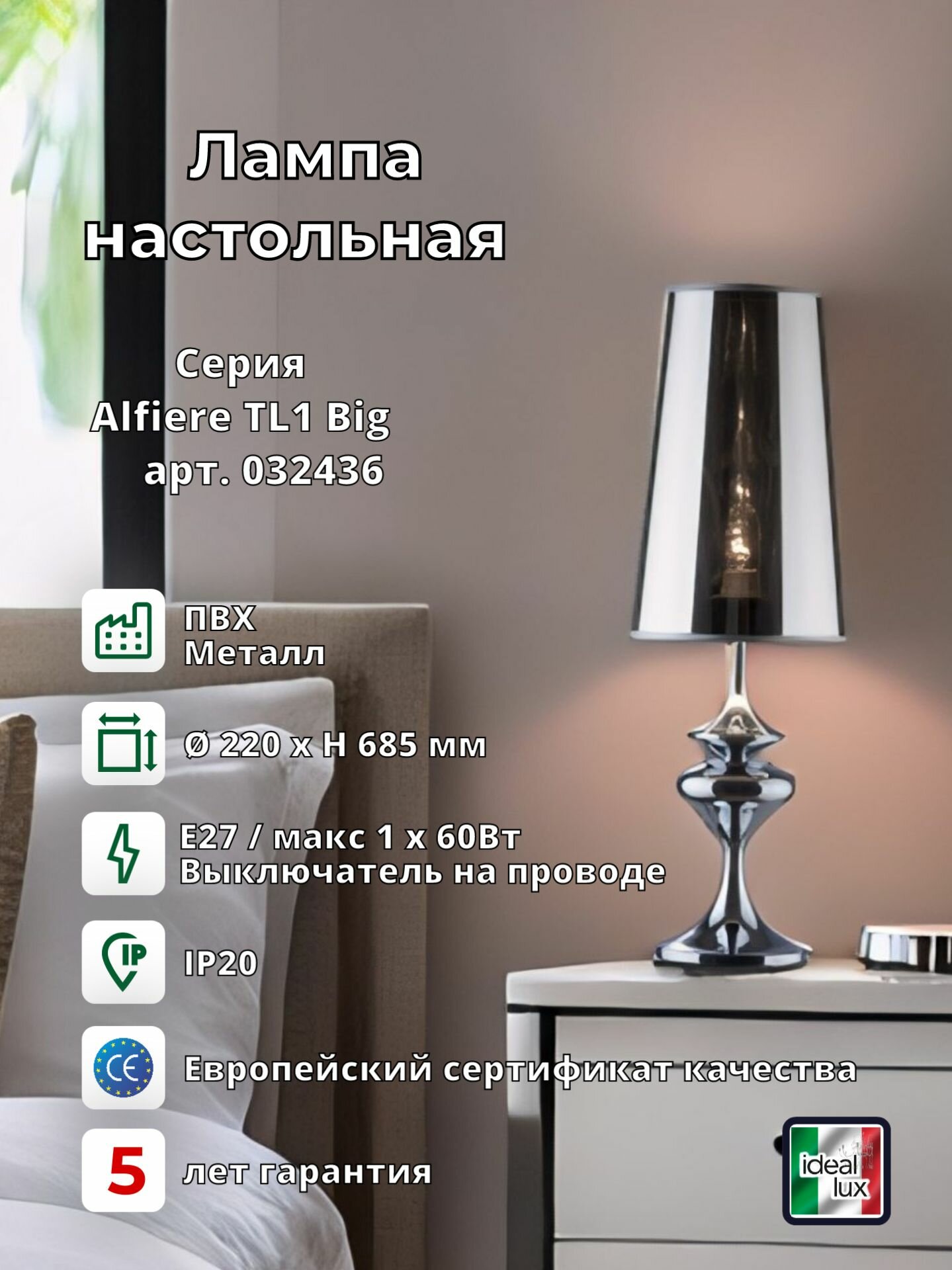 Лампа настольная ideal lux Alfiere TL1 Big макс.1х60Вт IP20 Е27 230В Хром Металл/ПВХ Выключатель Без лампы 032436. интересное: