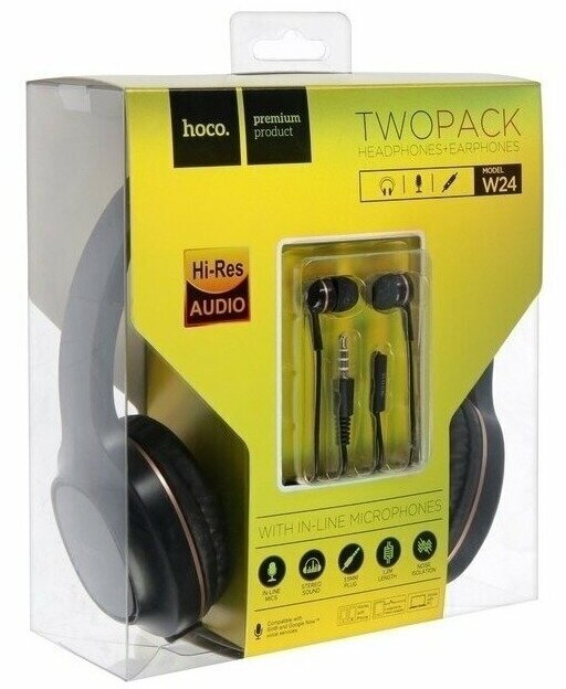 Комплект наушников Hoco W24, проводные, накладные + вакуумные, проводные, золотистые, цвет чёрный