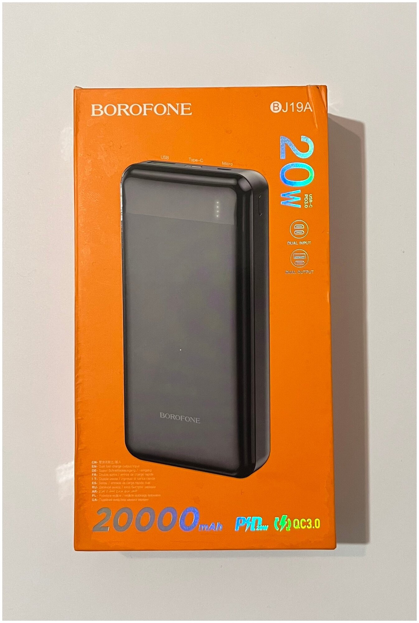 Мобильный аккумулятор BOROFONE BJ19A 20000mAh, QC3.0, 1 USB выход, микро USB, PD20W, индикатор, 3.0A, чёрный (6974443381603)