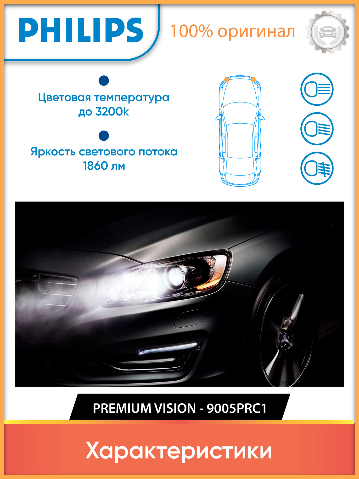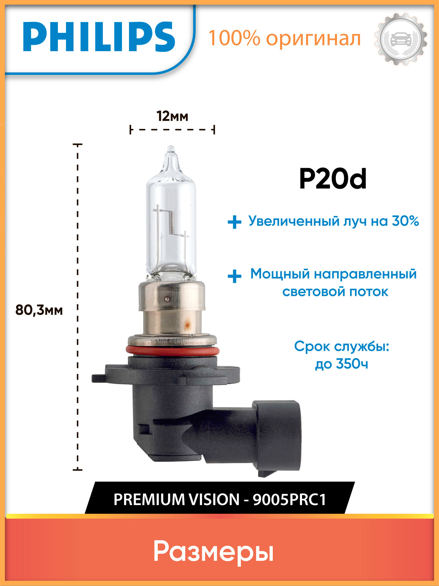 Лампа автомобильная PHILIPS Vision Premium HB3/9005 60W P20d+30% 12V, 1шт, 9005PRC1