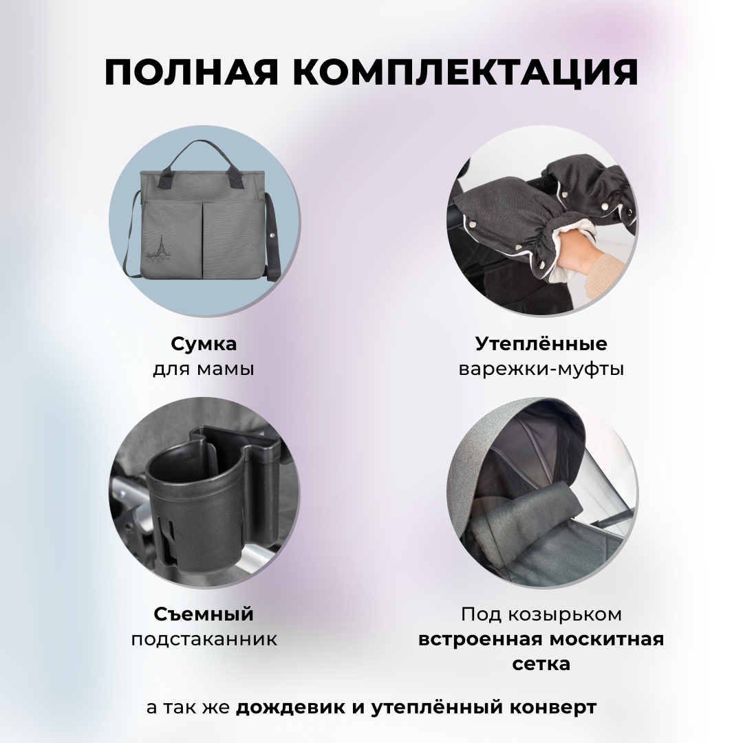 | Комплектация | коляска-трансформер / вместительная сумка-органайзер / подстаканник / дождевик / москитная сетка / утепленный флисовый конверт для ребенка / матрасик-вкладыш |