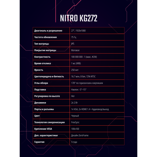 27" ACER Nitro KG272bmiix Black (IPS, 1920x1080, D-sub+HDMI+HDMI, 1 ms, 178°/178°, 250 cd/m, 1000:1 (100M:1), MM, встр. БП, VE