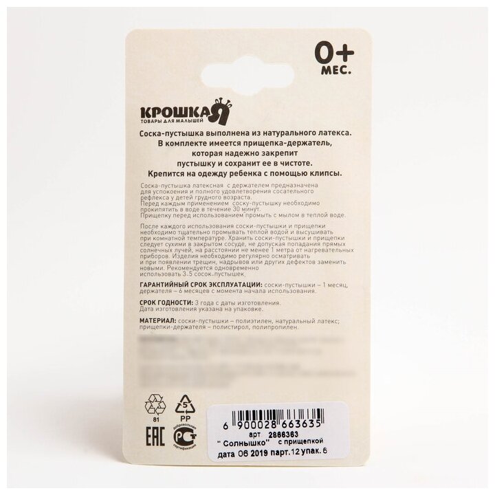 Пустышки Крошка Я Соска-пустышка латексная классическая с держателем «Солнышко», от 0 мес.