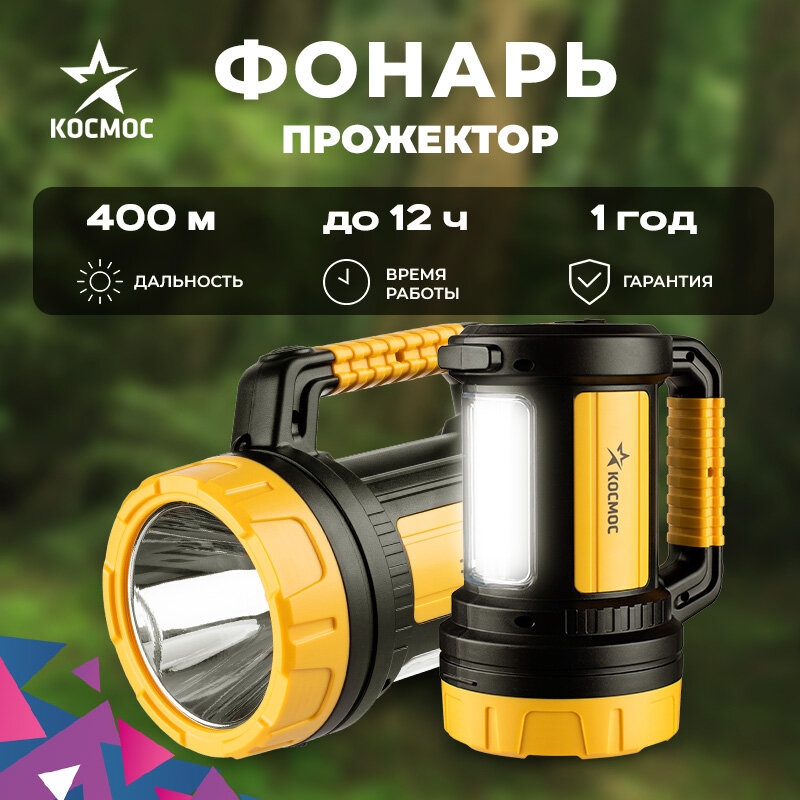 Космос фонарь-прожектор 2005W_Ex (акк.4V2Ah) LED 5W(300lm) +10W(380lm), жел./пласт 3 реж.з/у 220/12в (арт. 646375)