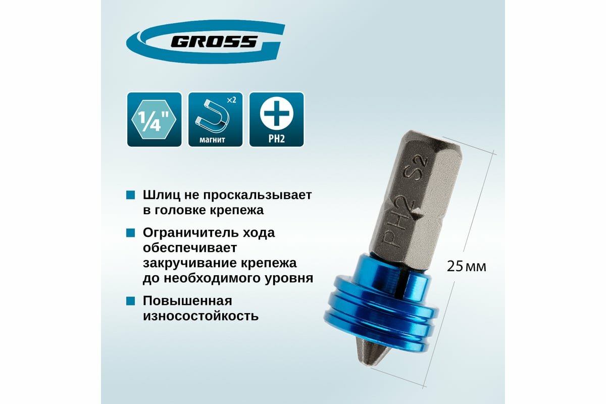 Биты Gross PH2x25мм с ограничителем и магнитом для Гкл, S2 11455 .