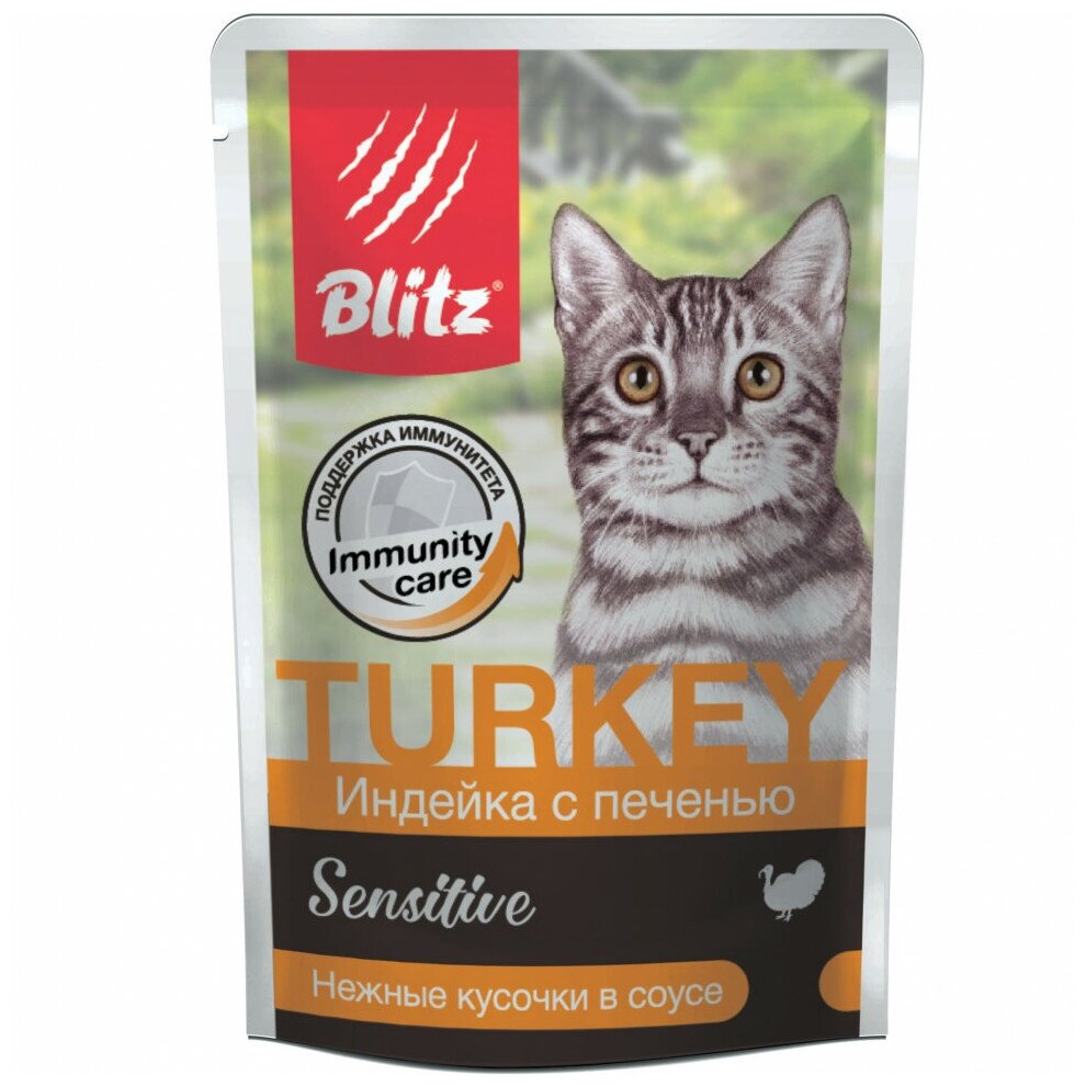 Влажный корм для кошек Blitz при чувствительном пищеварении, с индейкой, с печенью 24 шт. х 85 г (кусочки в соусе)