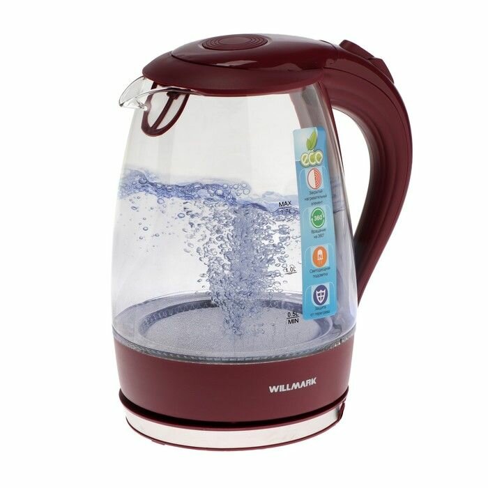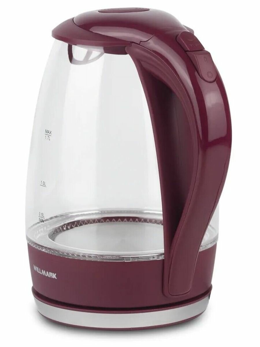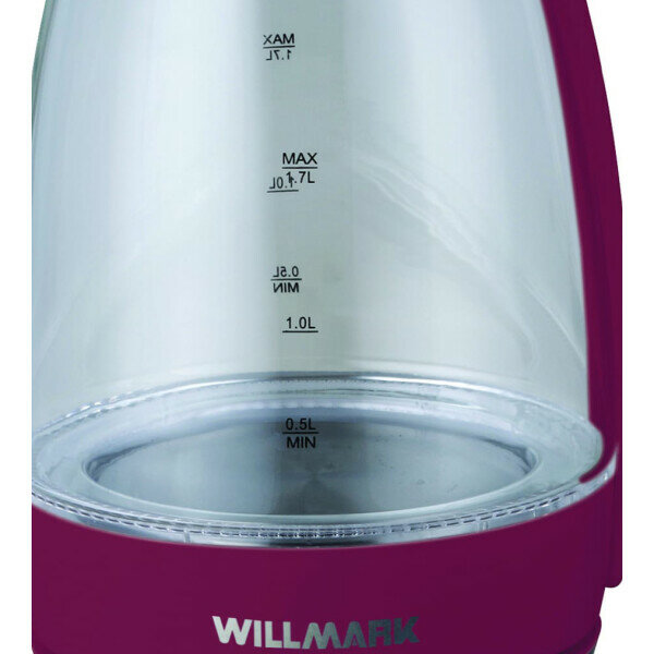 Чайник эл. WILLMARK WEK-1708G (1.7л, пов. на 360 град., LED-подсв., корп. из стекла, 2200Вт) Бордовый