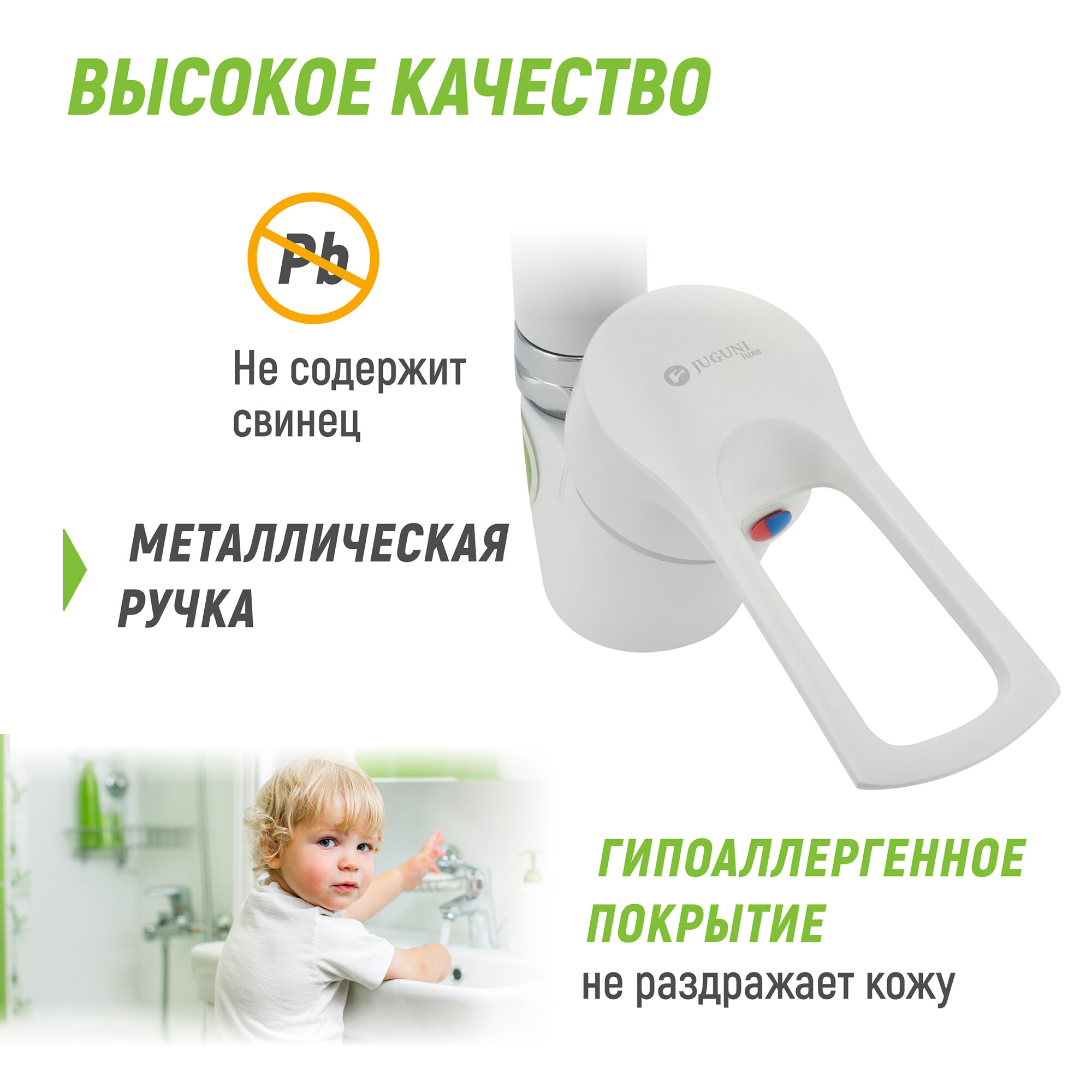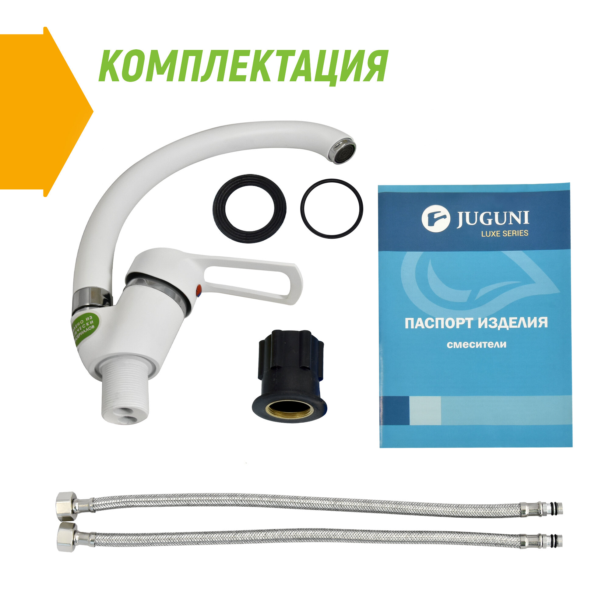 Смеситель для мойки цветной (белый) одноручный Juguni Luxe с поворотным изливом, 40 картридж, гайка интересное: