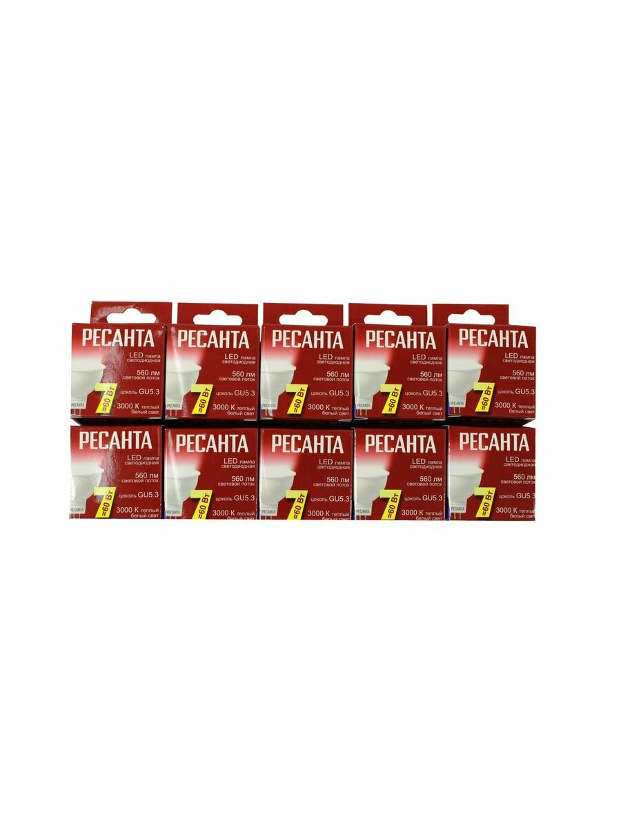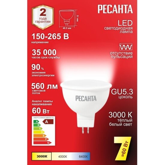 Лампа светодиодная Ресанта LL-R-MR16-7W-230-3K-GU5.3, 220 В, 7 Вт, 2700-3000К, 80 Ra, FR/матированная, MR16, 560 Лм, 35000ч