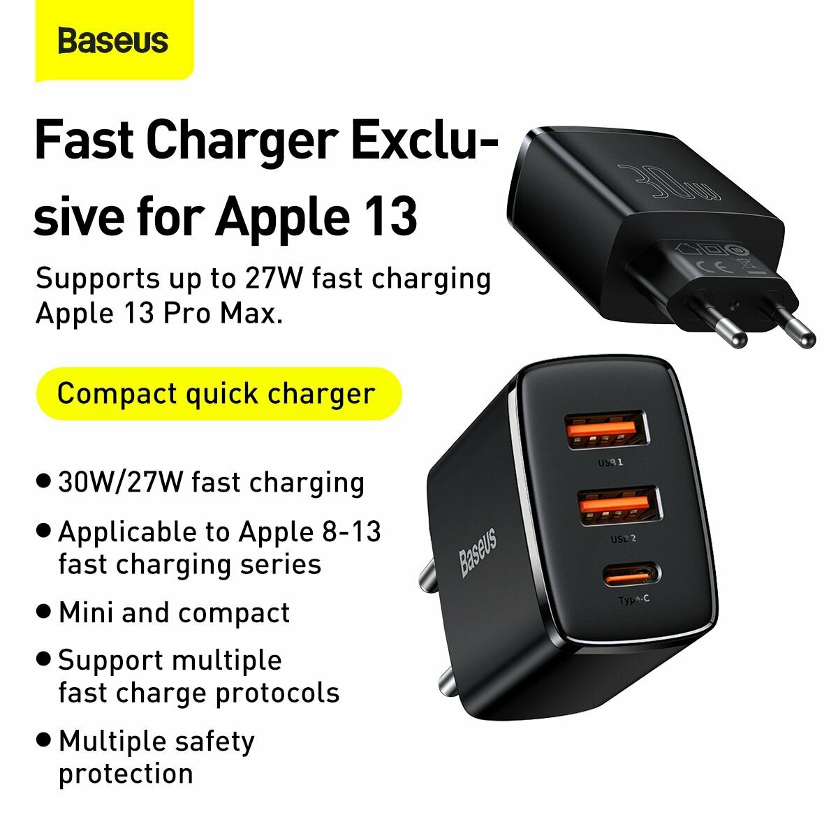 Купить Зарядное устройство Baseus Compact Quick Charger 2xUSB USB Type-C 30W EU Black CCXJ-E01