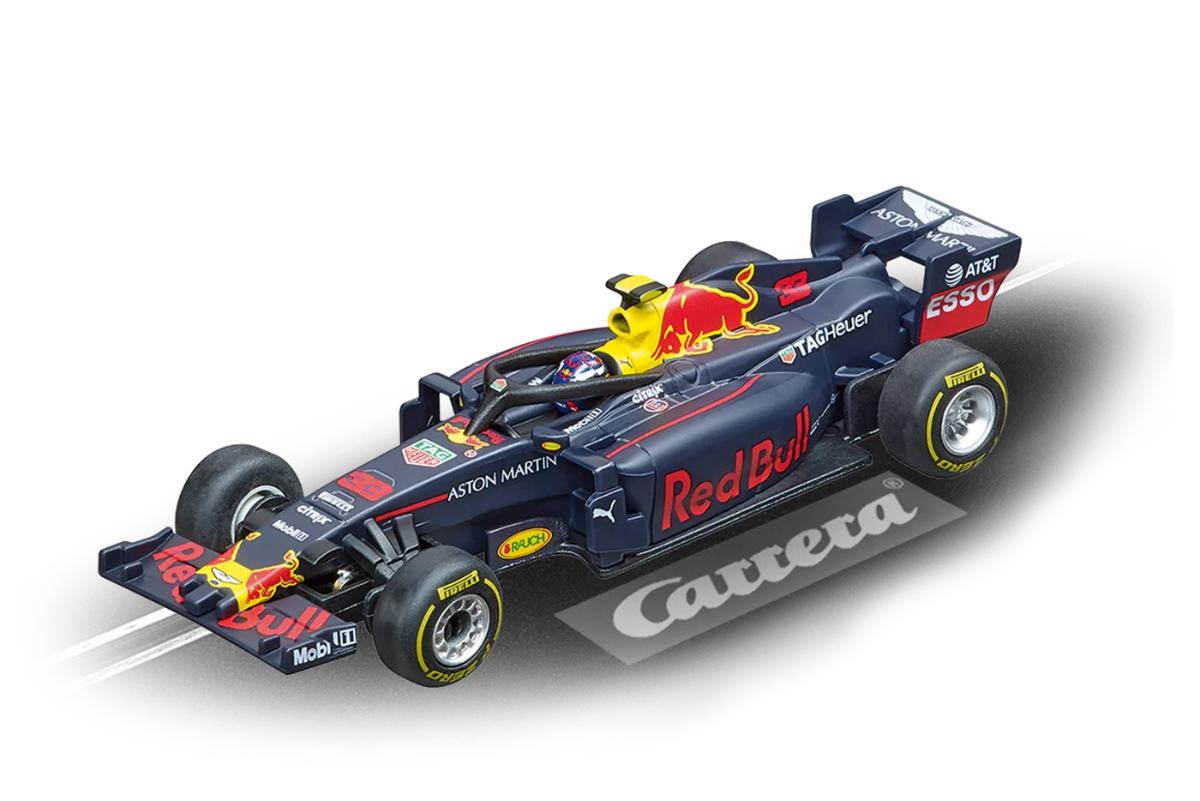 | Комплектация | сборные части трека, красно-белые ограничители на изгибах, 2 электронных регулятора скорости, механический счётчик кругов, автомобили: Red Bull Racing RB14 и Mercedes-AMG F1 W09 EQ Power+ |