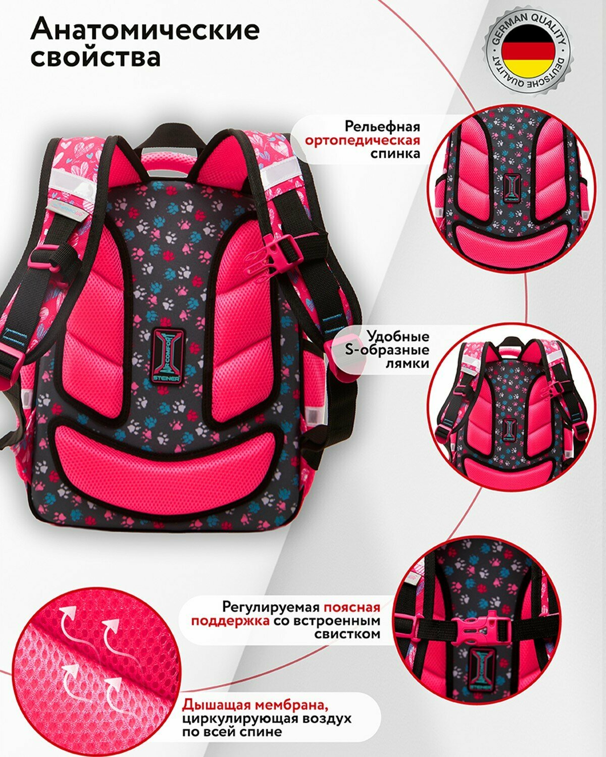 Рюкзак школьный (ранец) для девочки Steiner, полужёсткий, ортопедическая спинка, 3 отделения, фирменный брелок в подарок