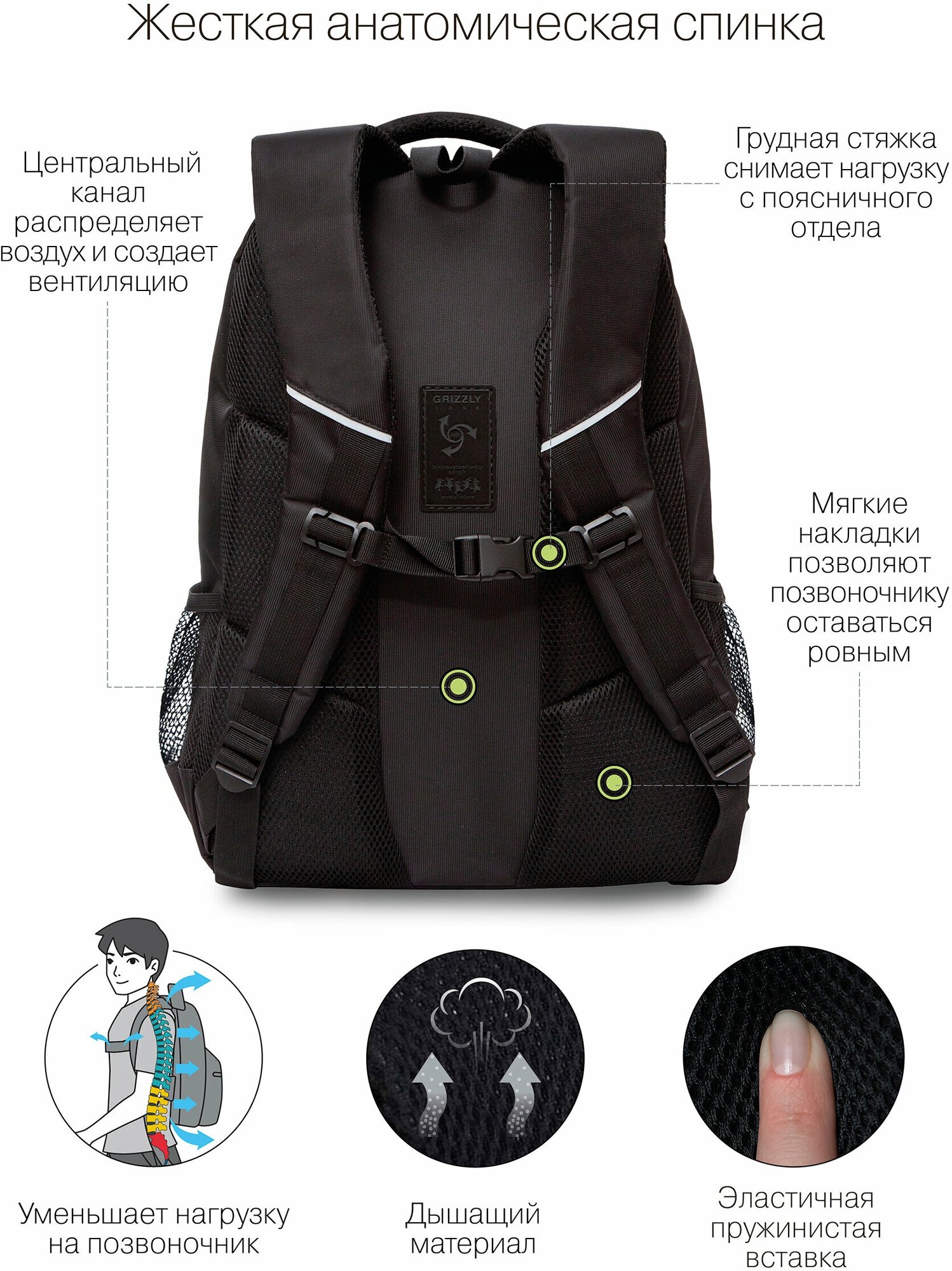Рюкзак Grizzly "The New Generation", 32х45х23 см, 2 отделения, 4 кармана, анатомическая спинка, черно-серый (RU-330-4/3)