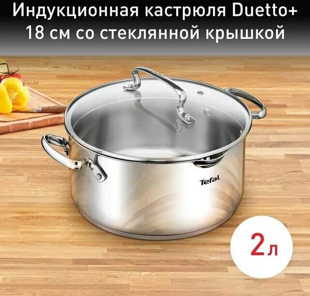 Кастрюля 24 см Tefal Duetto+ G7194655 с крышкой, из нержавеющей стали, подходит для индукциинные, со сливным носиком